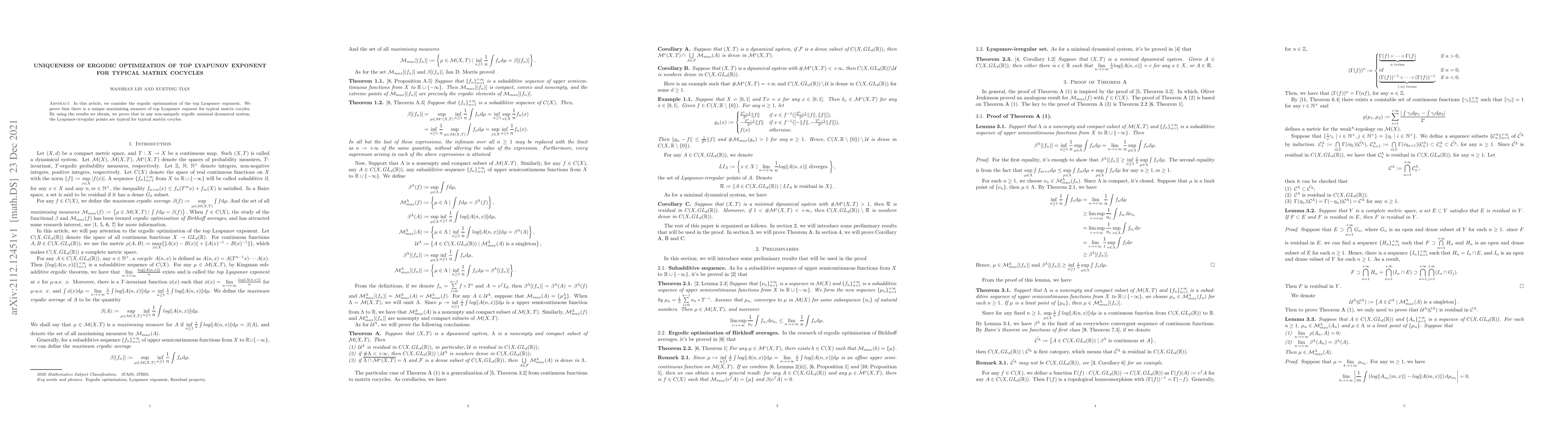 This paper proves the uniqueness of the maximizing measure for the top Lyapunov exponent in typical matrix cocycles. It also demonstrates that in non-uniquely ergodic minimal dynamical systems, Lyapunov-irregular points are typical for these matrix cocycles.