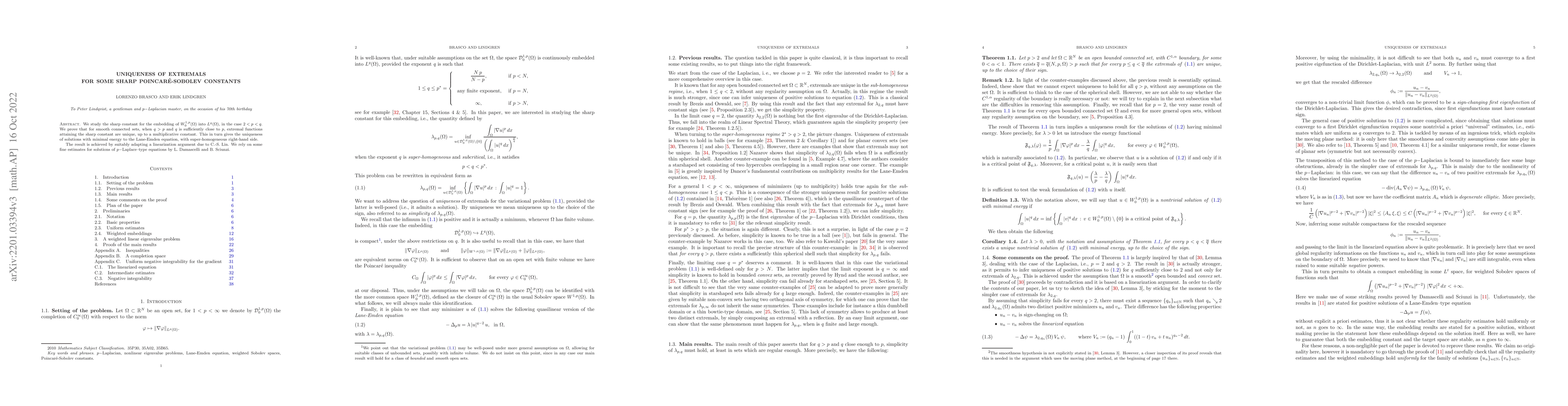 This paper investigates the uniqueness of extremal functions for the sharp Poincaré-Sobolev constant in the embedding of $W^{1,p}_0(\Omega)$ into $L^q(\Omega)$. It proves that for smooth connected sets, when $q$ is close to $p$ and $q>p$, these extremal functions are unique up to a multiplicative constant, leading to the uniqueness of minimal energy solutions for the Lane-Emden equation.