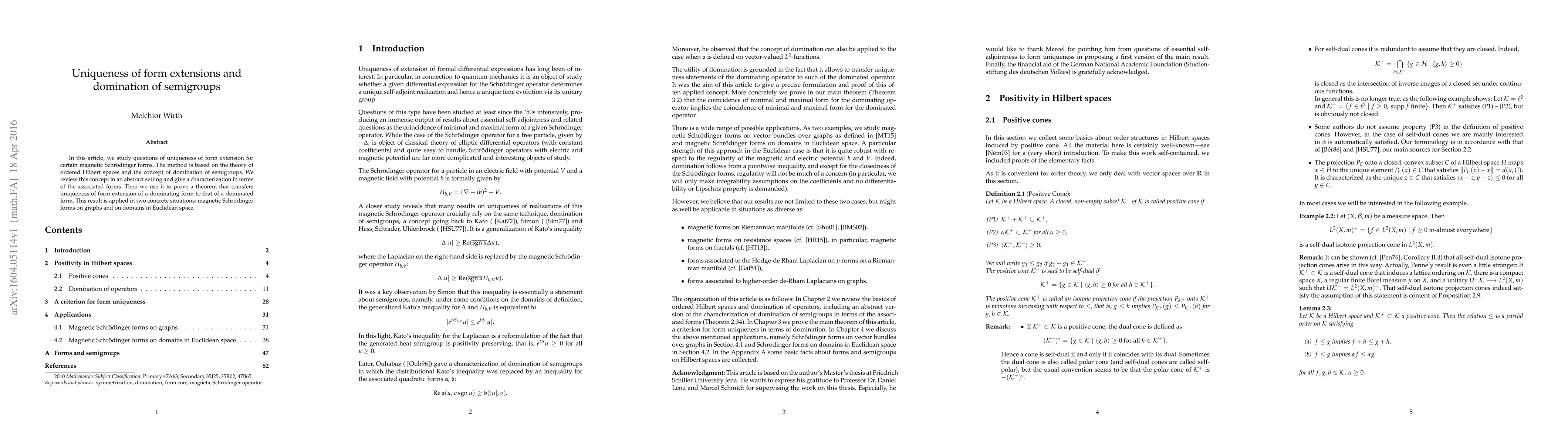 This paper explores the uniqueness of form extensions for magnetic Schrödinger forms, employing ordered Hilbert space theory and semigroup domination concepts. It provides a characterization of domination and proves a theorem transferring uniqueness from dominating to dominated forms, applied to magnetic Schrödinger forms on graphs and Euclidean domains.
