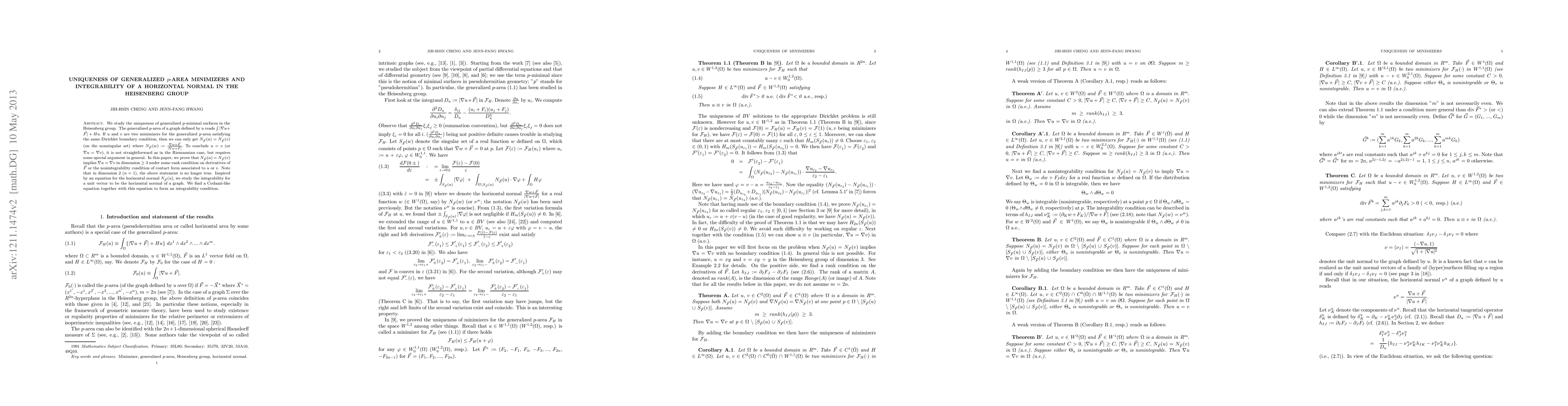 We study the uniqueness of generalized $p$-minimal surfaces in the Heisenberg group. The generalized $p$-area of a graph defined by $u$ reads $\int |\nabla u+\vec{F}| + Hu$. If $u$ and $v$ are two minimizers for the generalized $p$-area satisfying the same Dirichlet boundary condition, then we can only get $N_{\vec{F}}(u)$ $=$ $N_{\vec{F}}(v)$ (on the nonsingular set) where $N_{\vec{F}}(w)$ $:=$ $\frac{\nabla w+\vec{F}}{|\nabla w+\vec{F}|}.$ To conclude $u$ $=$ $v$ (or $\nabla u$ $=$ $\nabla v)$, it is not straightforward as in the Riemannian case, but requires some special argument in general. In this paper, for a generalized area functional including $p$-area, we prove that $N_{\vec{F}}(u)$ $=$ $N_{\vec{F}}(v)$ implies $\nabla u$ $=$ $\nabla v$ in dimension $\geq $ 3 under some rank condition on derivatives of $\vec{F}$ or the nonintegrability condition of contact form associated to $u$ or $v$. Note that in dimension 2 ($n=1),$ the above statement is no longer true. Inspired by an equation for the horizontal normal $N_{\vec{F}}(u),$ we study the integrability for a unit vector to be the horizontal normal of a graph. We find a Codazzi-like equation together with this equation to form an integrability condition.