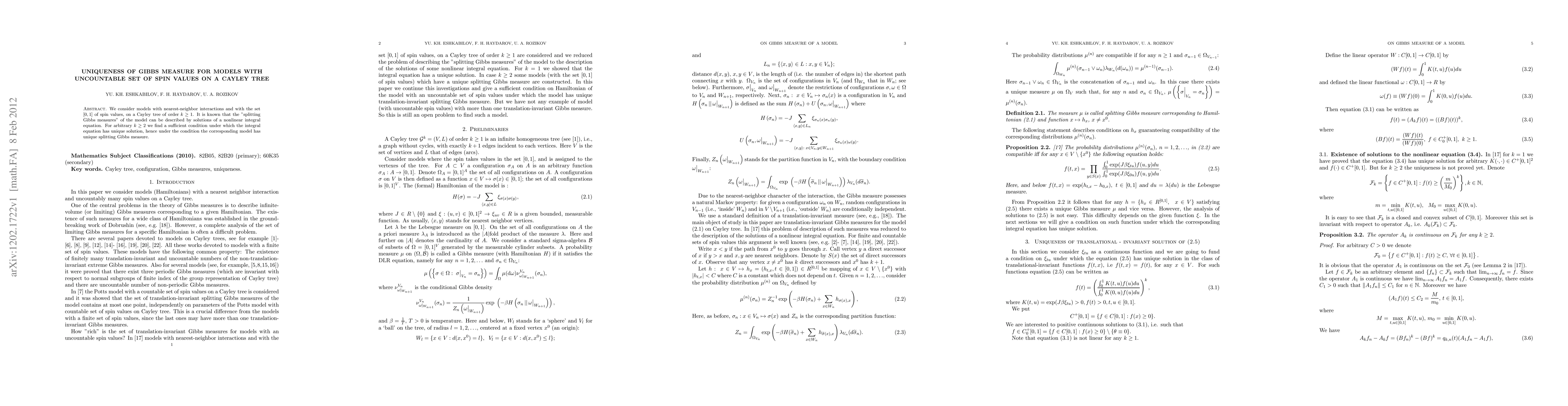 We consider models with nearest-neighbor interactions and with the set $[0,1]$ of spin values, on a Cayley tree of order $k\geq 1$. It is known that the "splitting Gibbs measures" of the model can be described by solutions of a nonlinear integral equation. For arbitrary $k\geq 2$ we find a sufficient condition under which the integral equation has unique solution, hence under the condition the corresponding model has unique splitting Gibbs measure.