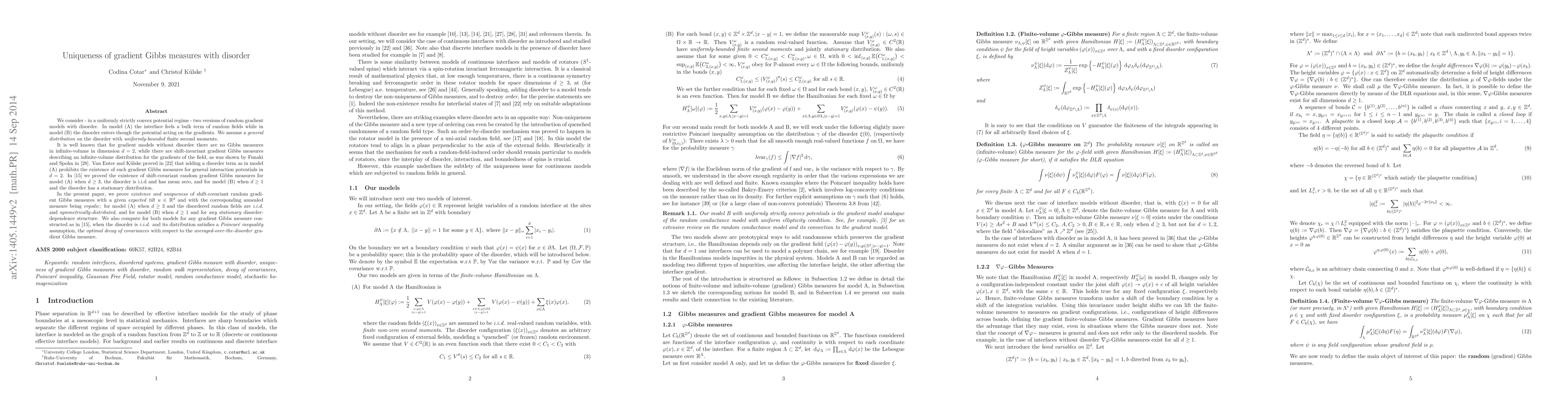 We consider - in uniformly strictly convex potential regime - two versions of random gradient models with disorder. In model (A) the interface feels a bulk term of random fields while in model (B) the disorder enters though the potential acting on the gradients. We assume a general distribution on the disorder with uniformly-bounded finite second moments. It is well known that for gradient models without disorder there are no Gibbs measures in infinite-volume in dimension $d = 2$, while there are shift-invariant gradient Gibbs measures describing an infinite-volume distribution for the gradients of the field, as was shown by Funaki and Spohn. Van Enter and Kuelske proved in 2008 that adding a disorder term as in model (A) prohibits the existence of such gradient Gibbs measures for general interaction potentials in $d = 2$. In Cotar and Kuelske (2012) we proved the existence of shift-covariant random gradient Gibbs measures for model (A) when $d\geq 3$, the disorder is i.i.d and has mean zero, and for model (B) when $d\geq 1$ and the disorder has stationary distribution. In the present paper, we prove existence and uniqueness of shift-covariant random gradient Gibbs measures with a given expected tilt $u\in R^d$ and with the corresponding annealed measure being ergodic: for model (A) when $d\geq 3$ and the disordered random fields are i.i.d. and symmetrically-distributed, and for model (B) when $d\geq 1$ and for any stationary disorder dependence structure. We also compute for both models for any gradient Gibbs measure constructed as in Cotar and Kuelske (2012), when the disorder is i.i.d. and its distribution satisfies a Poincar\'e inequality assumption, the optimal decay of covariances with respect to the averaged-over-the-disorder gradient Gibbs measure.