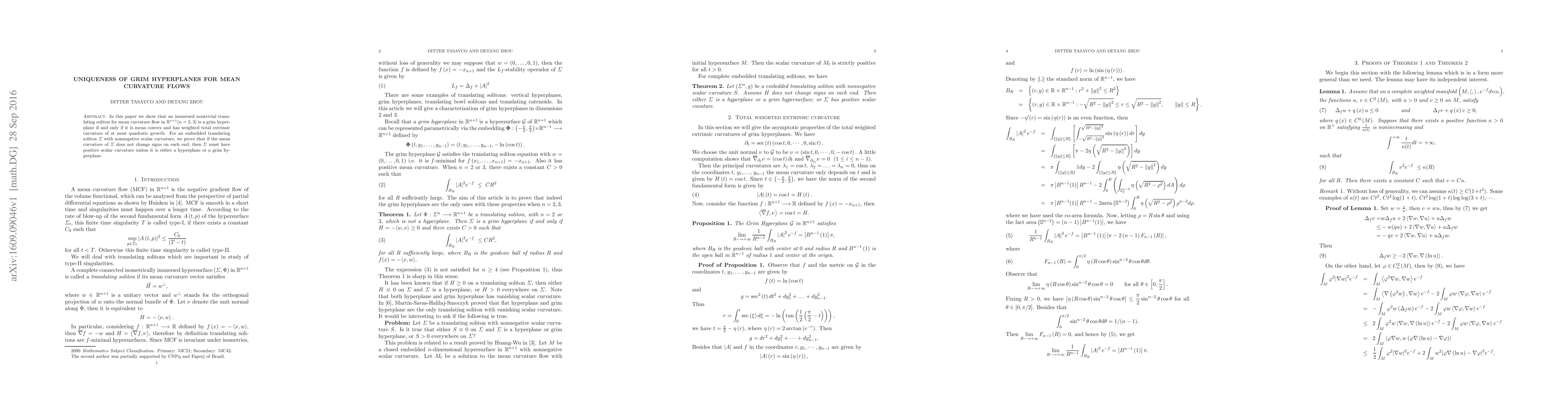 In this paper we show that an immersed nontrivial translating soliton for mean curvature flow in $\mathbb{R}^{n+1}$($n=2,3)$ is a grim hyperplane if and only if it is mean convex and has weighted total extrinsic curvature of at most quadratic growth. For an embedded translating soliton $\Sigma$ with nonnegative scalar curvature, we prove that if the mean curvature of $\Sigma$ does not change signs on each end, then $\Sigma$ must have positive scalar curvature unless it is either a hyperplane or a grim hyperplane.