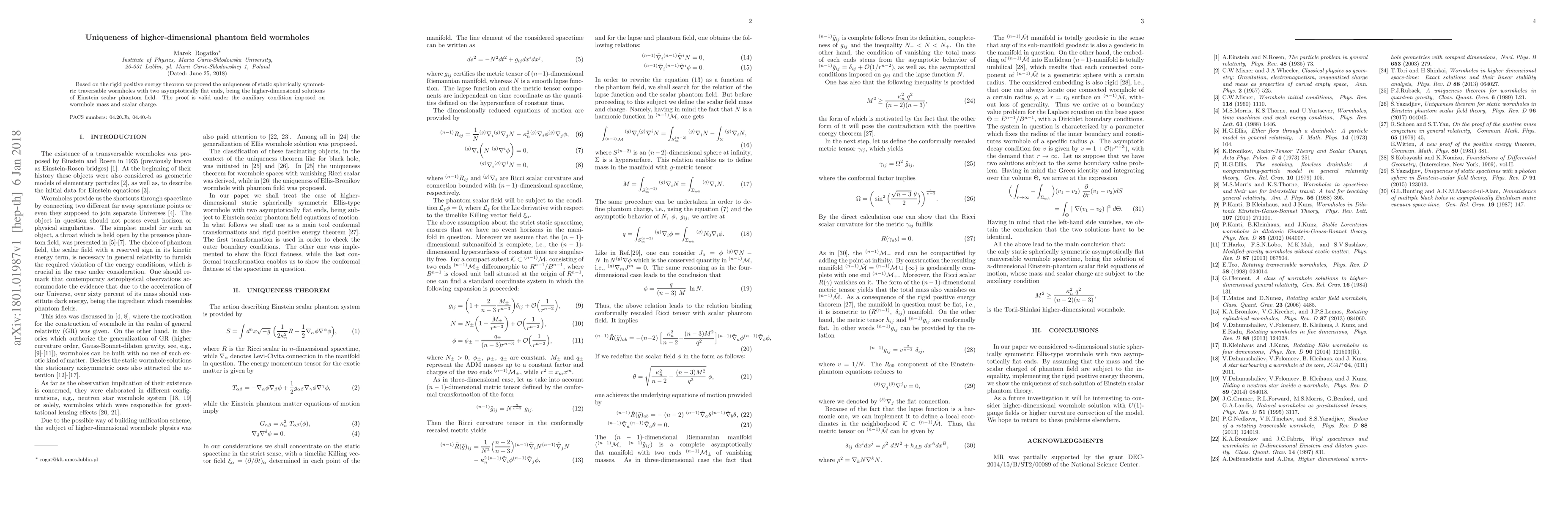 This paper proves the uniqueness of static, spherically symmetric traversable wormholes in higher dimensions using the rigid positive energy theorem, under specific conditions on wormhole mass and scalar charge, for solutions derived from Einstein scalar phantom fields.