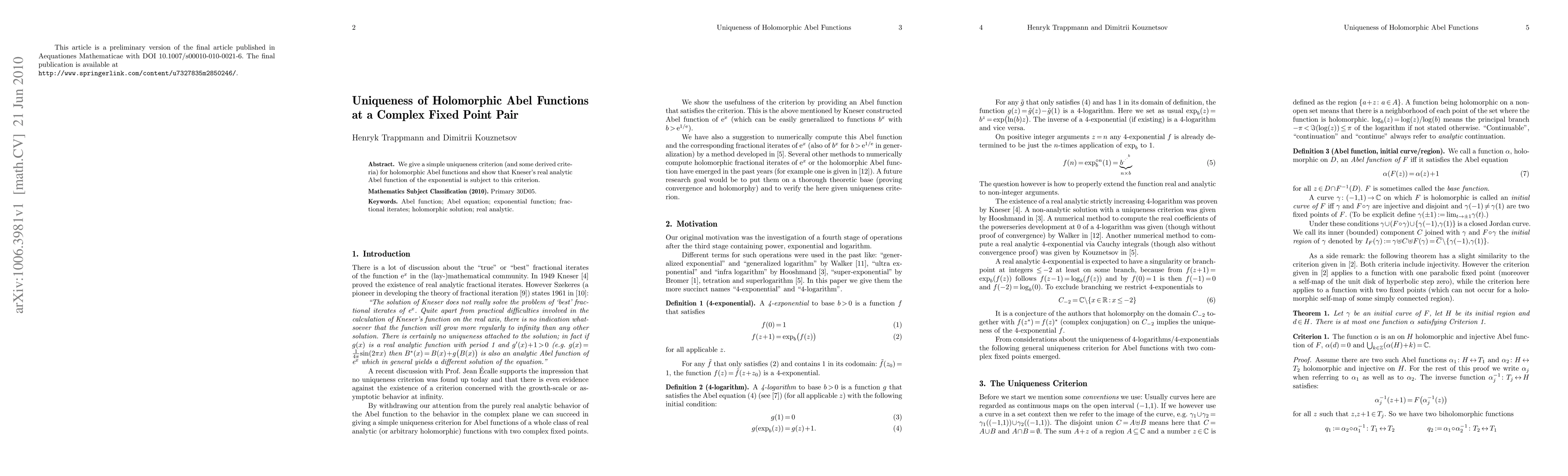 We give a simple uniqueness criterion (and some derived criteria) for holomorphic Abel functions and show that Kneser's real analytic Abel function of the exponential is subject to this criterion.