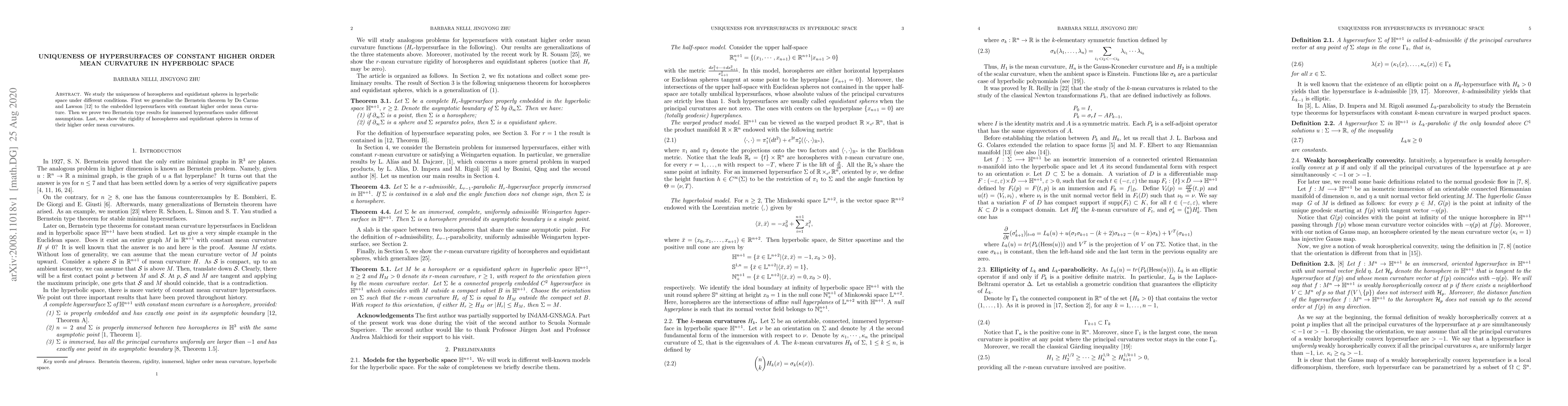 Summary: This paper generalizes Bernstein's theorem for hypersurfaces with constant higher order mean curvature in hyperbolic space, proving their uniqueness, and demonstrates the rigidity of specific geometric structures like horospheres and equidistant spheres based on their higher order mean curvature properties.