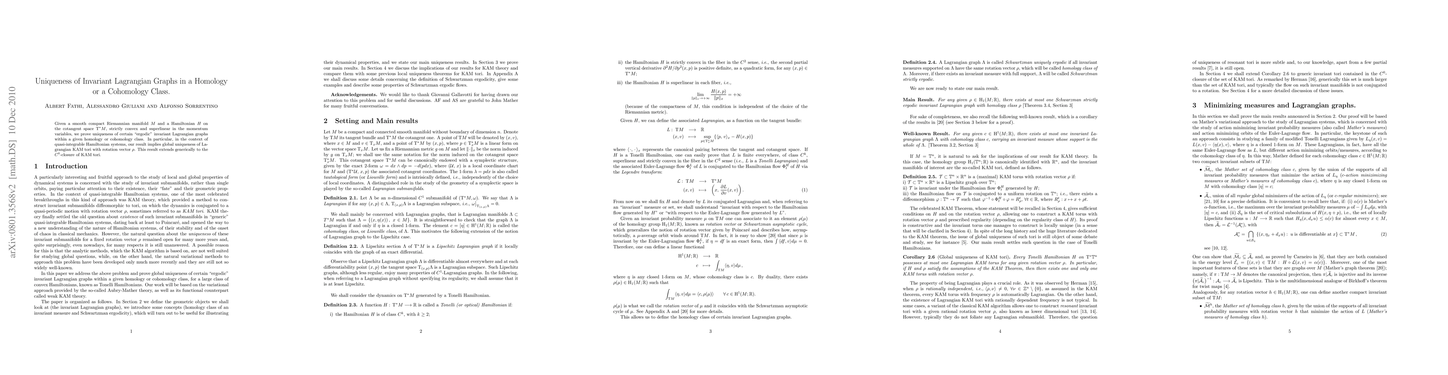 Given a smooth compact Riemannian manifold $M$ and a Hamiltonian $H$ on the cotangent space $T^*M$, strictly convex and superlinear in the momentum variables, we prove uniqueness of certain ergodic invariant Lagrangian graphs within a given homology or cohomology class. In particular, in the context of quasi-integrable Hamiltonian systems, our result implies global uniqueness of Lagrangian KAM tori with rotation vector $\rho$. This result extends generically to the $C^0$-closure of KAM tori.