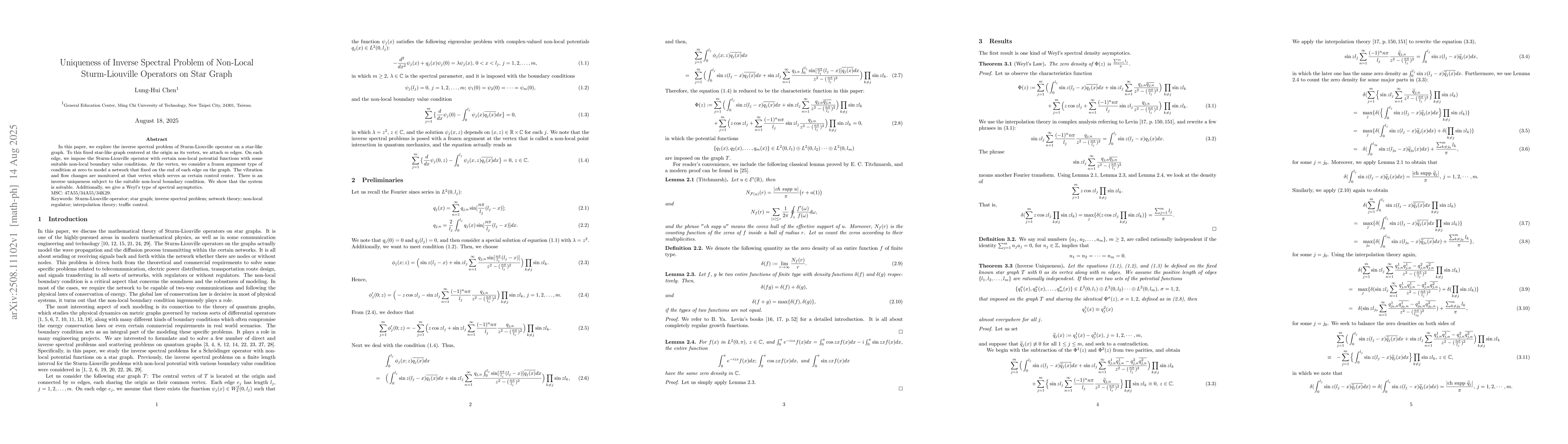 In this paper, we explore the inverse spectral problem of Sturm-Liouville operator on a star-like graph. To this fixed star-like graph centered at the origin as its vertex, we attach $m$ edges. On each edge, we impose the Sturm-Liouville operator with certain non-local potential functions with some suitable non-local boundary value conditions. At the vertex, we consider a frozen argument type of condition at zero to model a network that fixed on the end of each edge on the graph. The vibration and flow changes are monitored at that vertex which serves as certain control center. There is an inverse uniqueness subject to the suitable non-local boundary condition. We show that the system is solvable. Additionally, we give a Weyl's type of spectral asymptotics.
