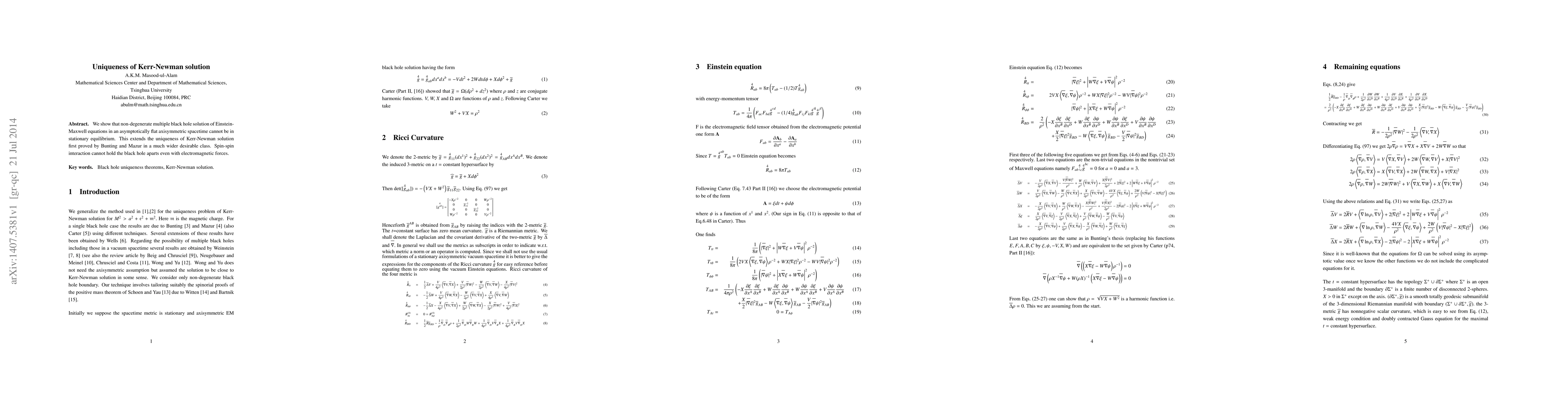 Summary: The paper demonstrates that non-degenerate multiple black hole solutions of Einstein-Maxwell equations in asymptotically flat, axisymmetric spacetimes cannot be in stationary equilibrium, extending the uniqueness of the Kerr-Newman solution to a broader class. Electromagnetic forces cannot counteract spin-spin interactions that would otherwise hold black holes apart.