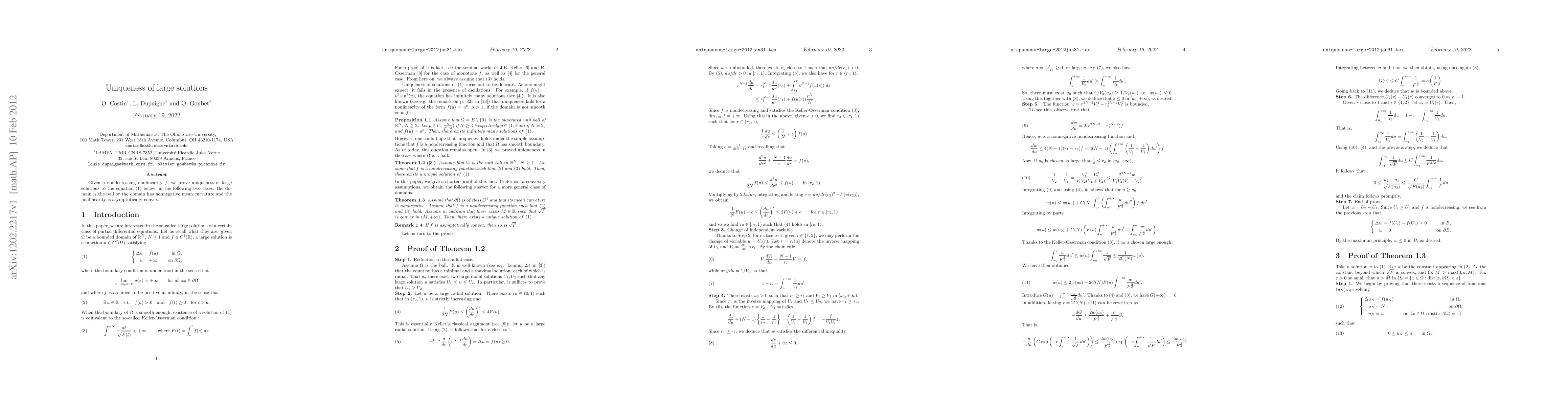 Given a nondecreasing nonlinearity $f$, we prove uniqueness of large solutions in the following two cases: the domain is the ball or the domain has nonnegative mean curvature and the nonlinearity is asymptotically convex.