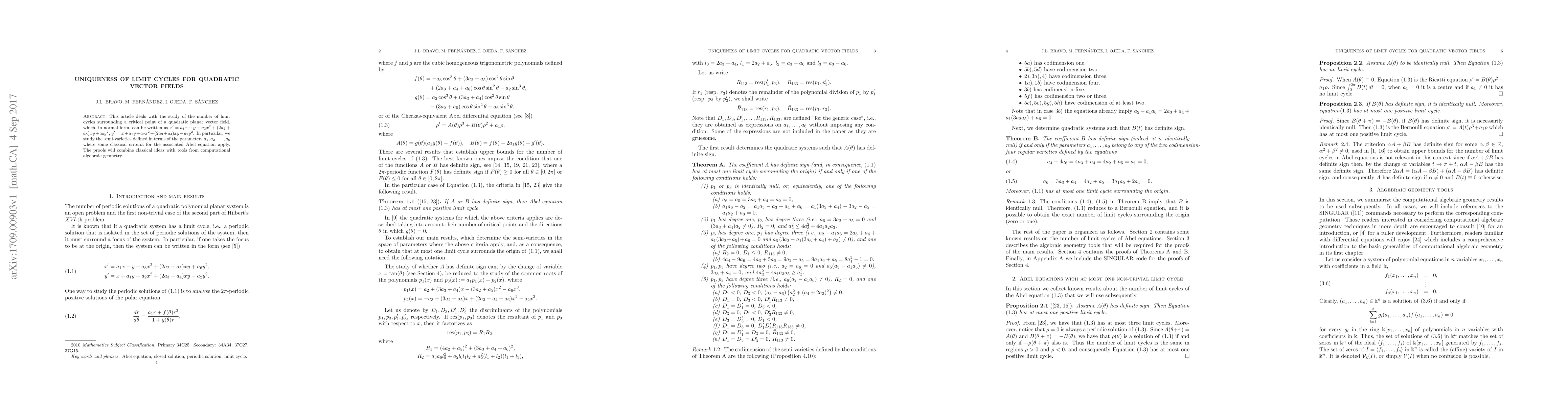 This study investigates the uniqueness of limit cycles in quadratic planar vector fields, finding conditions for their existence based on parameters $a_1$ to $a_6$, combining classical ideas with computational algebraic geometry tools.