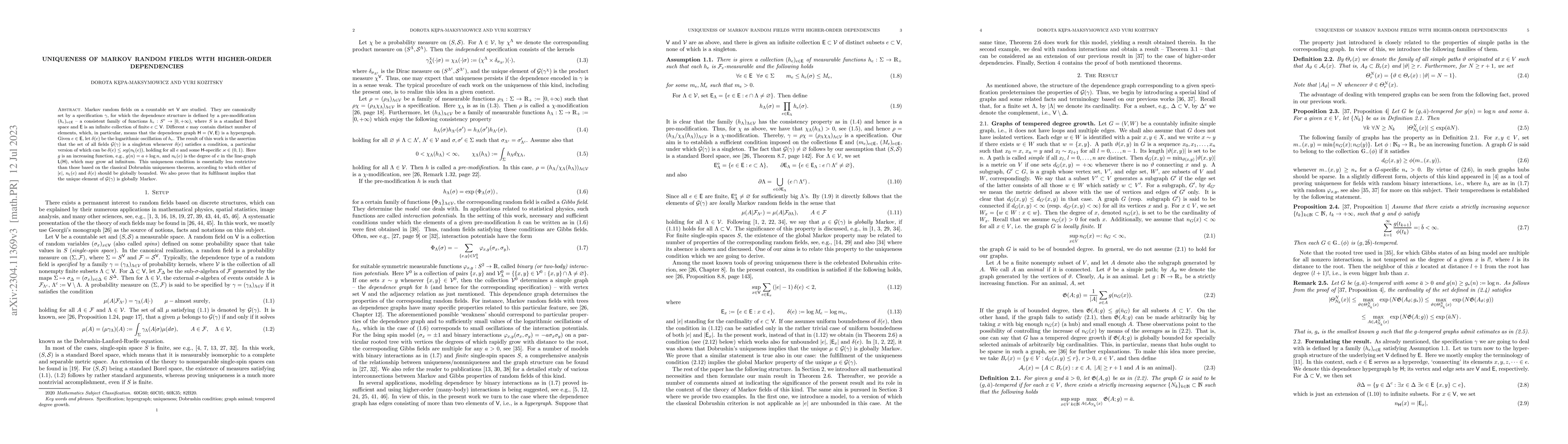 Markov random fields on a countable set $\sf V$ are studied. They are canonically set by a specification $\gamma$, for which the dependence structure is defined by a pre-modification $(h_e)_{e\in {\sf E}}$ -- a consistent family of functions $h_e : S^e\to [0,+\infty)$, where $S$ is a standard Borel space and $\sf E$ is an infinite collection of finite $e\subset {\sf V}$. Different $e$ may contain distinct number of elements, which, in particular, means that the dependence graph ${\sf H}=({\sf V}, {\sf E})$ is a hypergraph. Given $e\in {\sf E}$, let $\delta (e)$ be the logarithmic oscillation of $h_e$. The result of this work is the assertion that the set of all fields $\mathcal{G}(\gamma)$ is a singleton whenever $\delta(e)$ satisfies a condition, a particular version of which can be $\delta(e) \leq \varkappa g(n_{\sf L}(e))$, holding for all $e$ and some $\sf H$-specific $\varkappa\in (0,1)$. Here $g$ is an increasing function, e.g., $g(n) = a+\log n$, and $n_{\sf L}(e)$ is the degree of $e$ in the line-graph ${\sf L}({\sf H})$, which may grow ad infinitum. This uniqueness condition is essentially less restrictive than those based on classical Dobrushin's methods, according to which either of $|e|$, $n_{\sf L}(e)$ and $\delta(e)$ should be globally bounded. We also prove that its fulfilment implies that the unique element of $\mathcal{G}(\gamma)$ is globally Markov.