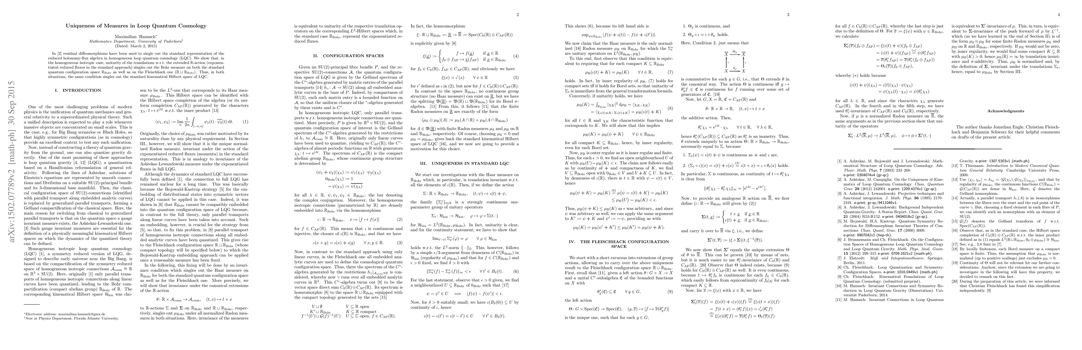 In a paper of Ashtekar and Campiglia, residual diffeomorphisms have been used to single out the standard representation of the reduced holonomy-flux algebra in homogeneous loop quantum cosmology (LQC). We show that, in the homogeneous isotropic case, unitarity of the translations w.r.t. the extended $\mathbb{R}$-action (exponentiated reduced fluxes in the standard approach) singles out the Bohr measure on both the standard quantum configuration space $\mathbb{R}_\mathrm{Bohr}$ as well as on the Fleischhack one. Thus, in both situation, the same condition singles out the standard kinematical Hilbert space of LQC.