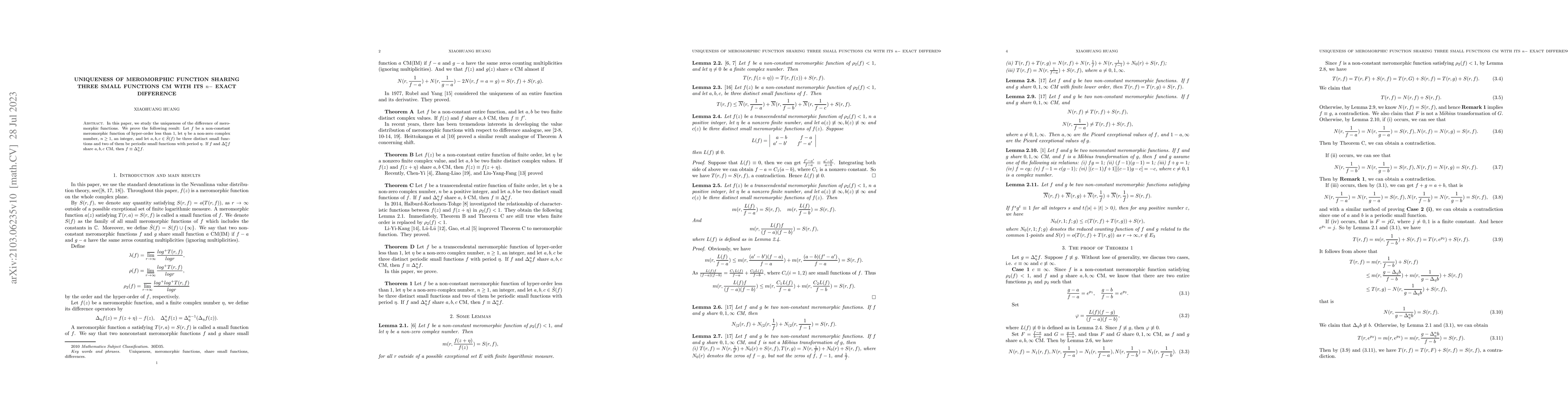 This paper proves that if a non-constant meromorphic function $f$ and its $n$-exact difference $\Delta_{\eta}^{n}f$ share three distinct small functions $a, b, c$ CM (counting multiplicities), then $f$ is identical to $\Delta_{\eta}^{n}f$. The study focuses on meromorphic functions of hyper-order less than 1.