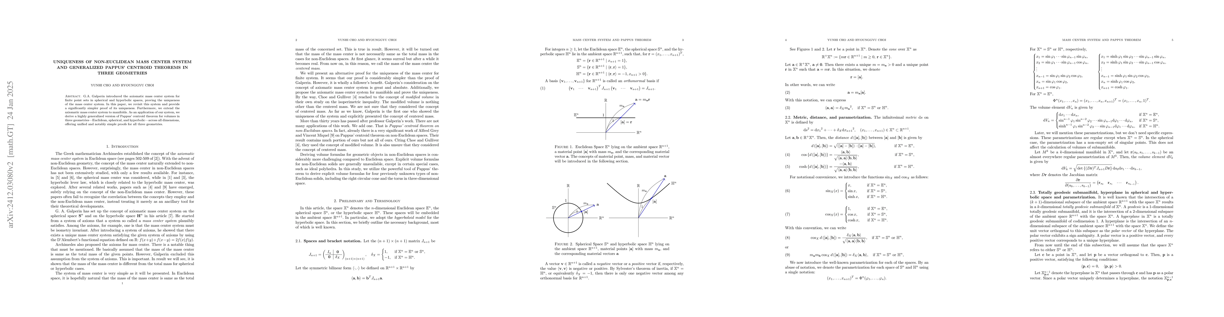 This paper simplifies the proof of the uniqueness of Galperin's axiomatic mass center system in spherical and hyperbolic spaces and extends it to manifolds. It also generalizes Pappus' centroid theorem for volumes across Euclidean, spherical, and hyperbolic geometries, providing unified and straightforward proofs.