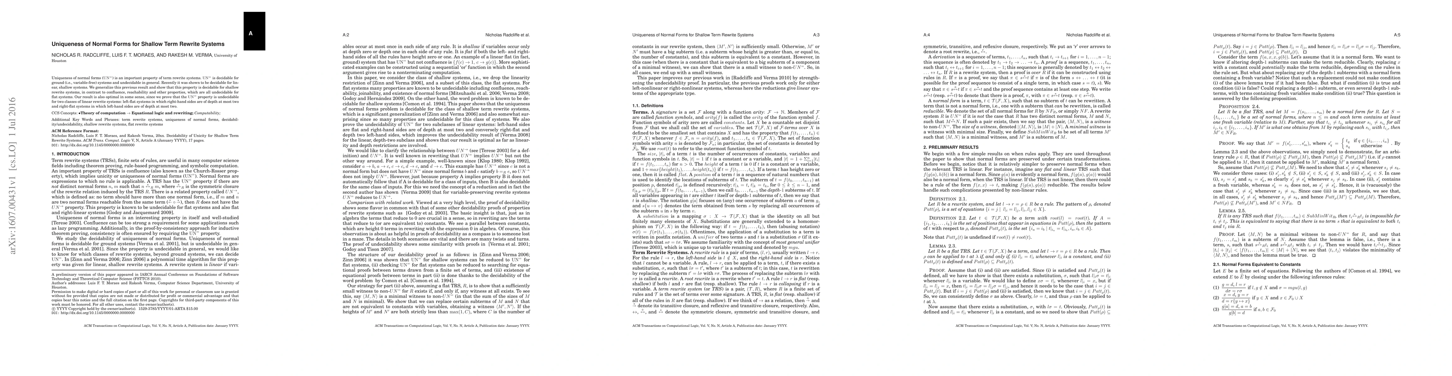 This paper demonstrates that the uniqueness of normal forms ($UN^=$) is decidable for shallow term rewrite systems, contrasting with undecidability for confluence and reachability in flat systems. The authors also show that $UN^=$ remains undecidable for certain linear systems, proving the optimality of their results.