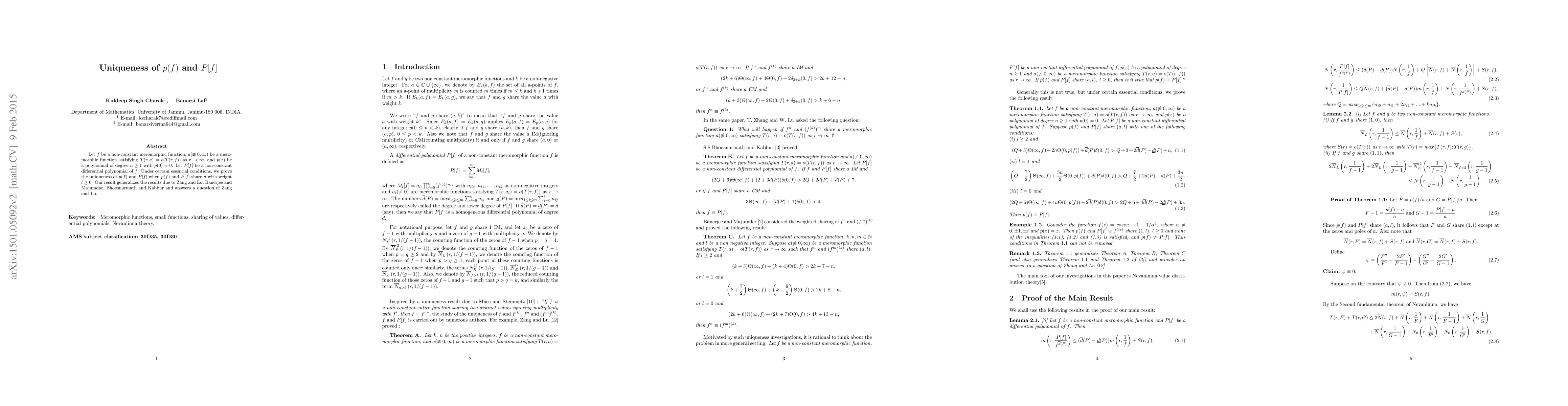 Let f be a non constant meromorphic function and a(not identically zero or infinity) be a meromorphic function satisfying T(r,a) = o(T(r,f)) as r tends to infinity, and p(z) be a polynomial of degree n greater than or equal to 1 with p(0) = 0. Let P[f] be a non constant differential polynomial of f. Under certain essential conditions, we prove the uniqueness of p(f) and P[f] when p(f) and P[f] share a with weight l greater than or equal to zero. Our result generalizes the results due to Zang and Lu, Banerjee and Majumder, Bhoosnurmath and Kabbur and answers a question of Zang and Lu.