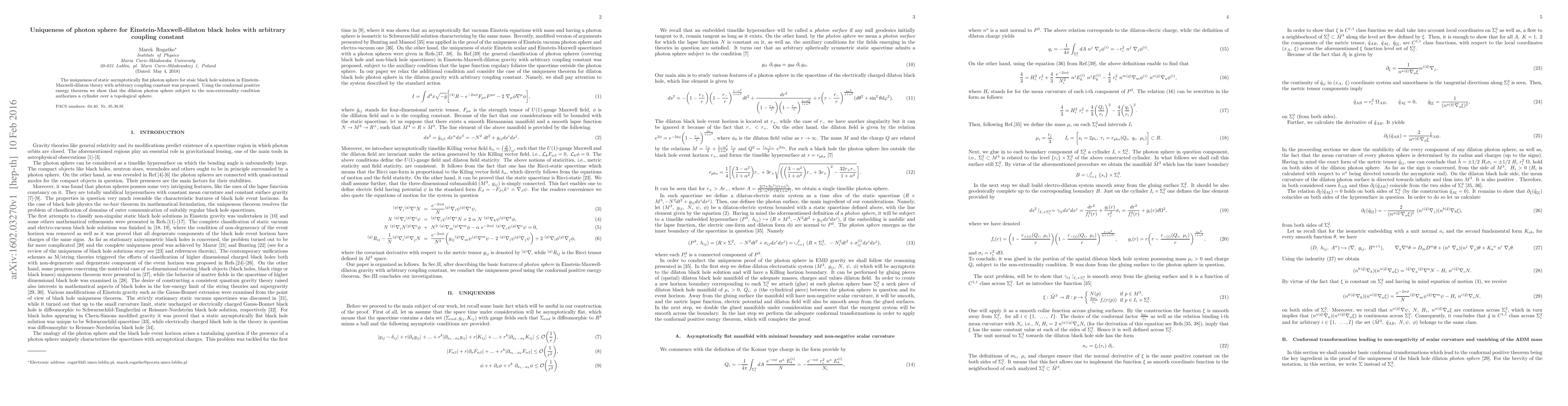 Summary: This paper proves the uniqueness of the static, asymptotically flat photon sphere in Einstein-Maxwell-dilaton black holes with arbitrary coupling constants, demonstrating that the dilaton sphere allows a cylindrical structure over a topological sphere under non-extremality conditions.