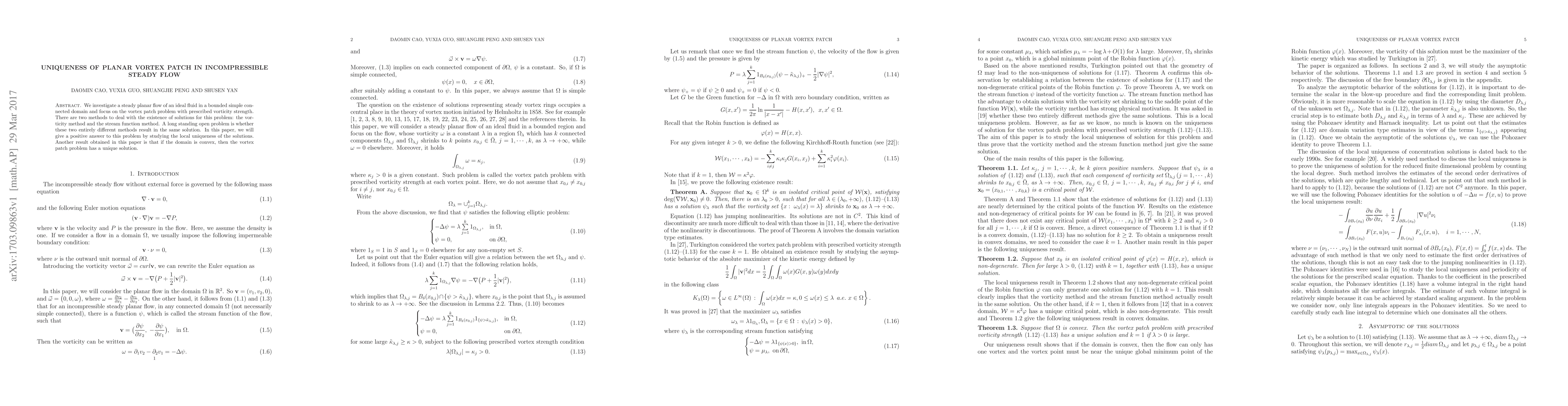 The paper employs a combination of vorticity and stream function methods to investigate the steady planar flow of an ideal fluid in a bounded, simply-connected domain, focusing on the vortex patch problem with prescribed vorticity strength.