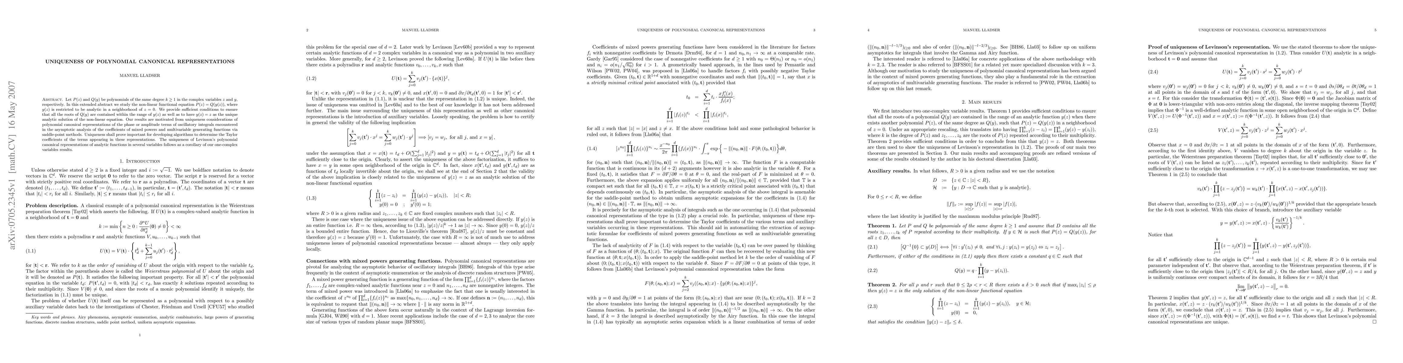 Let P(z) and Q(y) be polynomials of the same degree k>=1 in the complex variables z and y, respectively. In this extended abstract we study the non-linear functional equation P(z)=Q(y(z)), where y(z) is restricted to be analytic in a neighborhood of z=0. We provide sufficient conditions to ensure that all the roots of Q(y) are contained within the range of y(z) as well as to have y(z)=z as the unique analytic solution of the non-linear equation. Our results are motivated from uniqueness considerations of polynomial canonical representations of the phase or amplitude terms of oscillatory integrals encountered in the asymptotic analysis of the coefficients of mixed powers and multivariable generating functions via saddle-point methods. Uniqueness shall prove important for developing algorithms to determine the Taylor coefficients of the terms appearing in these representations. The uniqueness of Levinson's polynomial canonical representations of analytic functions in several variables follows as a corollary of our one-complex variables results.