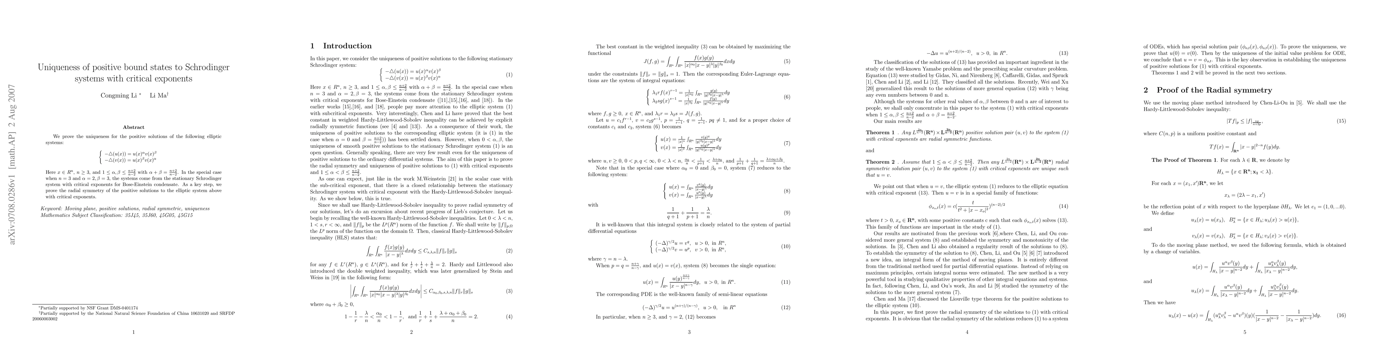 This paper proves the uniqueness of positive bound states for a class of Schrödinger systems with critical exponents, specifically for elliptic systems involving radial symmetry. The systems are derived from the stationary Schrödinger equation for Bose-Einstein condensates when $n=3$, $\alpha=2$, and $\beta=3$.