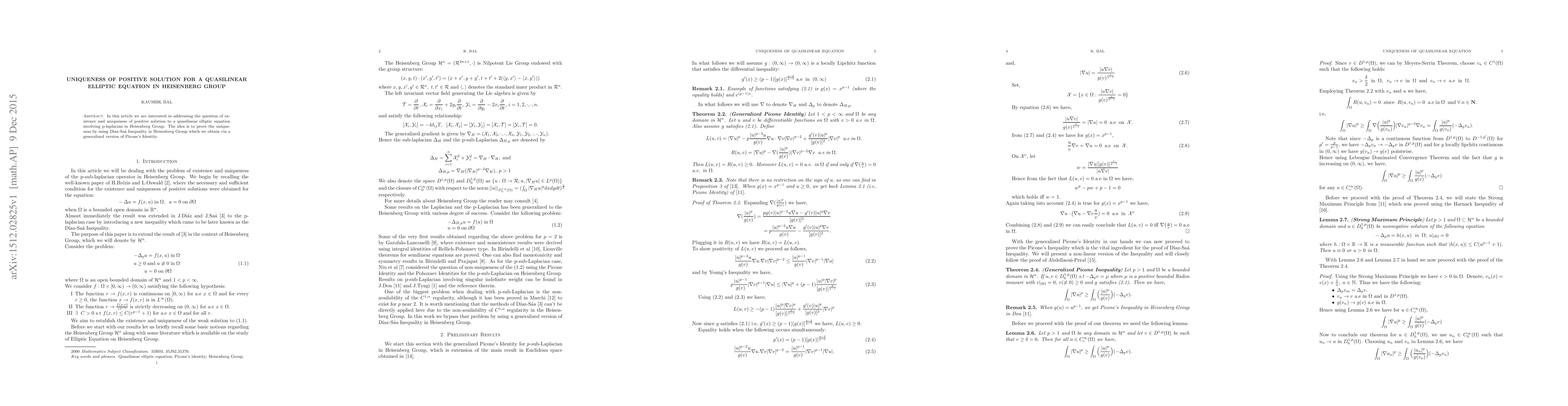 Summary: This paper investigates the existence and uniqueness of positive solutions for a quasilinear elliptic equation with a p-Laplacian in the Heisenberg Group. The uniqueness is proven using a Diaz-Saa Inequality derived from a generalized Picone's Identity.