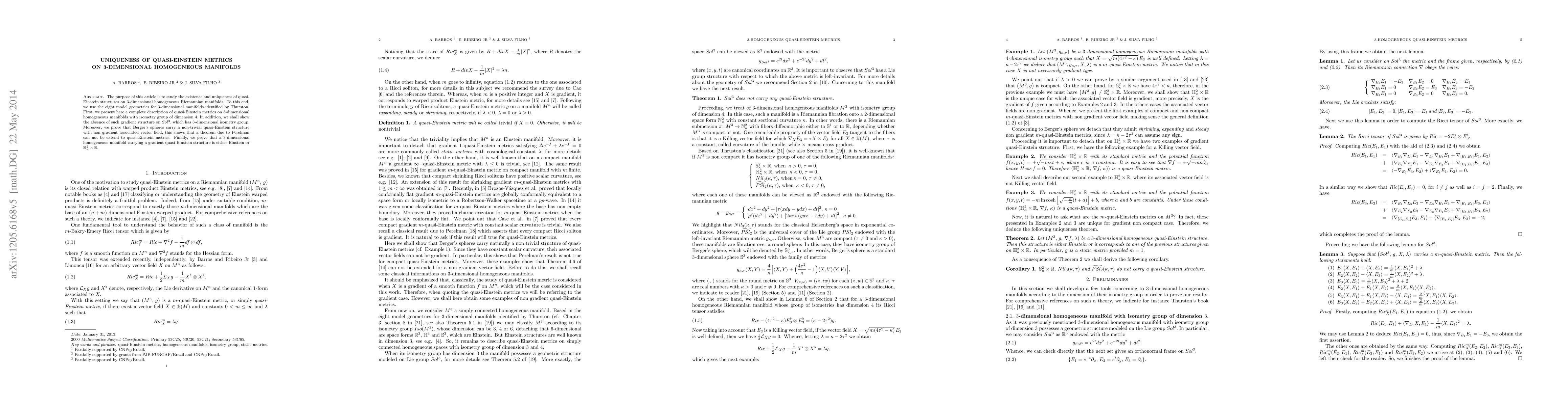 This paper investigates the uniqueness and existence of quasi-Einstein metrics on 3-dimensional homogeneous Riemannian manifolds, demonstrating that Berger's spheres possess non-trivial quasi-Einstein structures. It concludes that 3-dimensional homogeneous manifolds with gradient quasi-Einstein structures are either Einstein or of the form $\mathbb{H}^2_{\kappa} \times \mathbb{R}.$