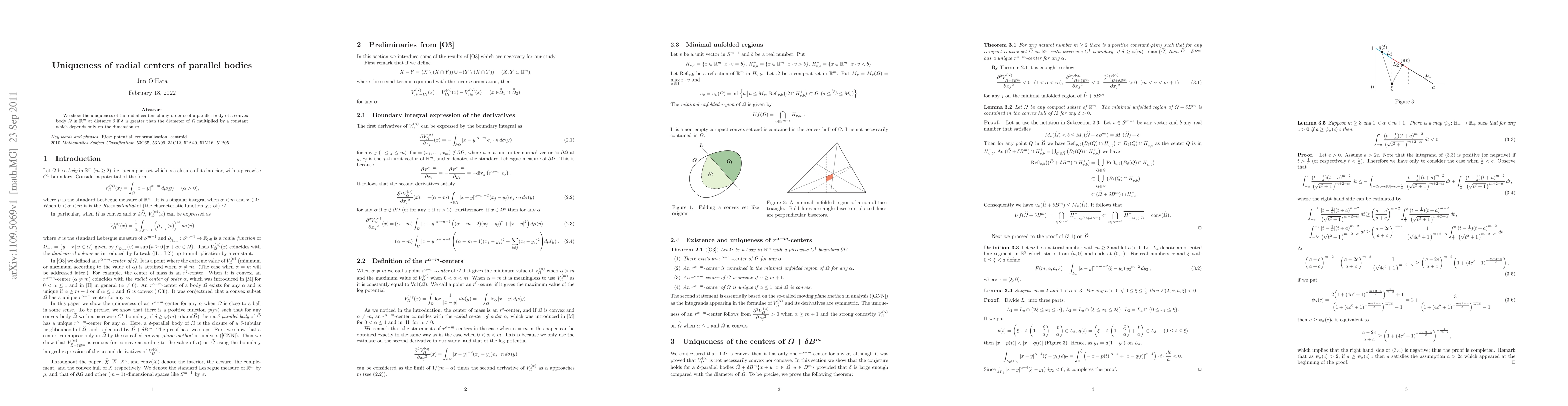 We show the uniqueness of the radial centers of any order $\alpha$ of a parallel body of a convex body $\Omega$ in $\mathbb R^m$ at distance $\delta$ if $\delta$ is greater than the diameter of $\Omega$ multiplied by a constant which depends only on the dimension $m$.