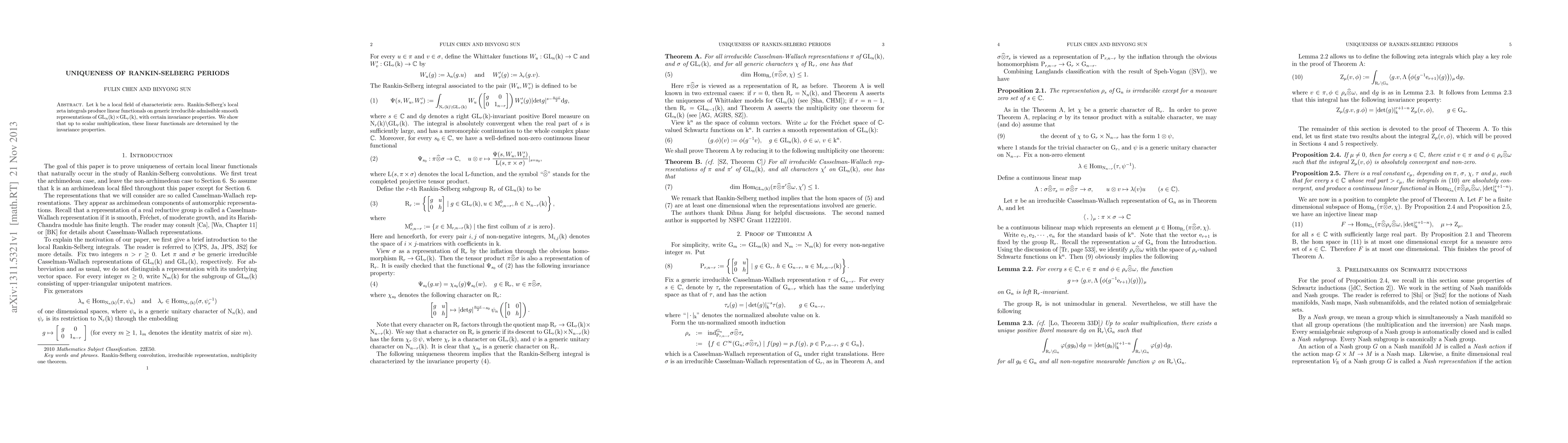 Let $k$ be a local field of characteristic zero. Rankin-Selberg's local zeta integrals produce linear functionals on generic irreducible admissible smooth representations of $GL_n(k)\times GL_r(k)$, with certain invariance properties. We show that up to scalar multiplication, these linear functionals are determined by the invariance properties.