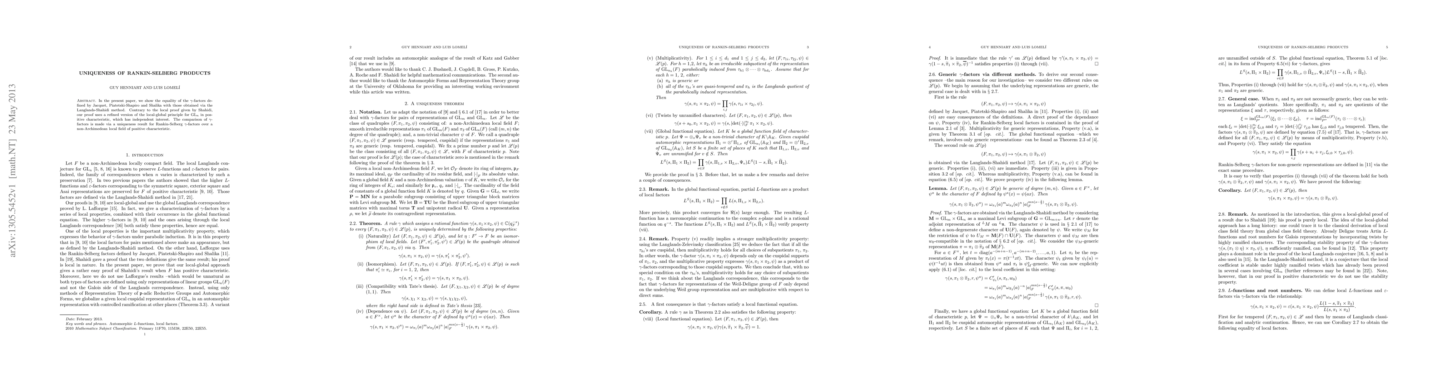 In the present paper, we show the equality of the $\gamma$-factors defined by Jacquet, Piatetski-Shapiro and Shalika with those obtained via the Langlands-Shahidi method. Our results are new in the case of positive characteristic, where we establish a refined version of the local-global principle for ${\rm GL}_n$ which has independent interest. In characteristic zero, the results are due to Shahidi. The comparison of $\gamma$-factors is made via a uniqueness result for Rankin-Selberg $\gamma$-factors.