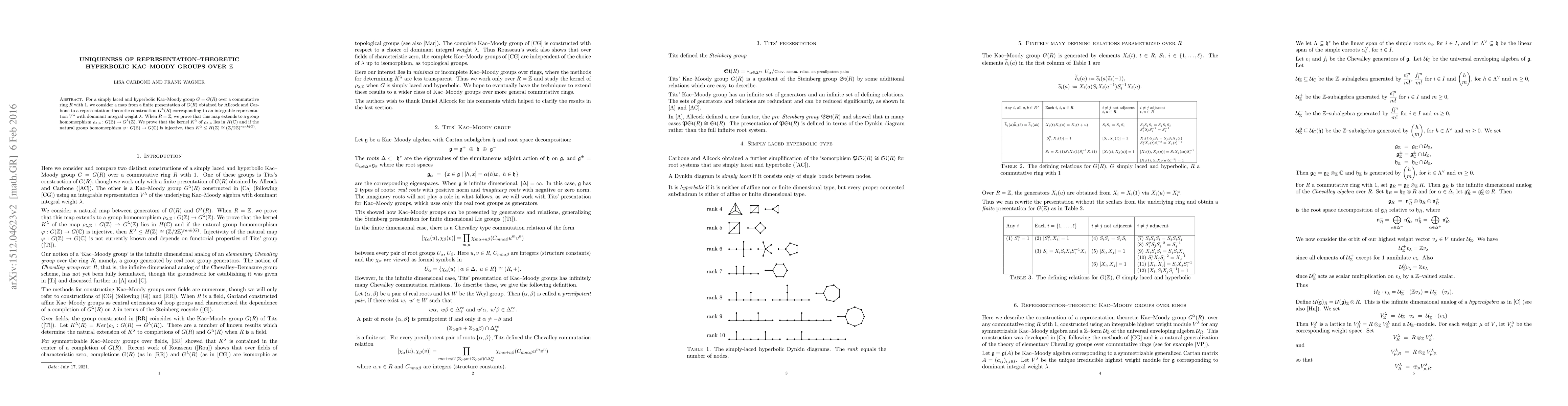 For a simply laced and hyperbolic Kac--Moody group $G=G(R)$ over a commutative ring $R$ with 1, we consider a map from a finite presentation of $G(R)$ obtained by Allcock and Carbone to a representation--theoretic construction $G^{\lambda}(R)$ corresponding to an integrable representation $V^{\lambda}$ with dominant integral weight $\lambda$. When $R=\Z$, we prove that this map extends to a group homomorphism $\rho_{\lambda,\Z}: G(\Z) \to G^{\lambda}(\Z).$ We prove that the kernel $K^{\lambda}$ of the map $\rho_{\lam,\Z}: G(\Z)\to G^{\lam}(\Z)$ lies in $H(\C)$ and if the group homomorphism $\varphi:G(\Z)\to G(\C)$ is injective, then $K^{\lambda}\leq H(\Z)\cong(\Z/2\Z)^{rank(G)}$.