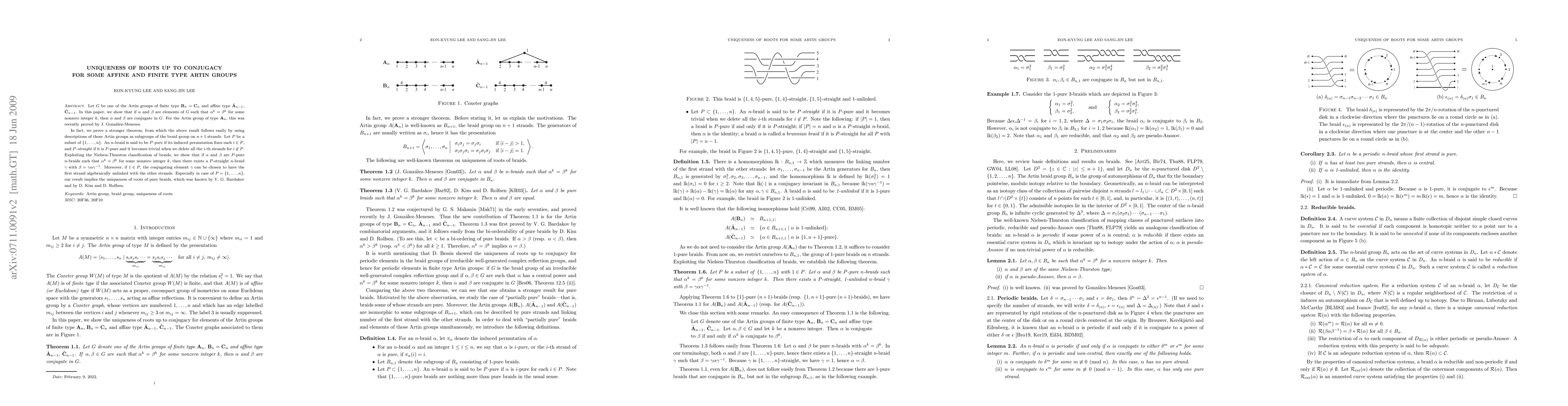 Let $G$ be one of the Artin groups of finite type ${\mathbf B}_n={\mathbf C}_n$, and affine type $\tilde{\mathbf A}_{n-1}$ and $\tilde{\mathbf C}_{n-1}$. In this paper, we show that if $\alpha$ and $\beta$ are elements of $G$ such that $\alpha^k=\beta^k$ for some nonzero integer $k$, then $\alpha$ and $\beta$ are conjugate in $G$. For the Artin group of type $\mathbf A_n$, this was recently proved by J. Gonz\'alez-Meneses. In fact, we prove a stronger theorem, from which the above result follows easily by using descriptions of those Artin groups as subgroups of the braid group on $n+1$ strands. Let $P$ be a subset of $\{1,...,n\}$. An $n$-braid is said to be \emph{$P$-pure} if its induced permutation fixes each $i\in P$, and \emph{$P$-straight} if it is $P$-pure and it becomes trivial when we delete all the $i$-th strands for $i\not\in P$. Exploiting the Nielsen-Thurston classification of braids, we show that if $\alpha$ and $\beta$ are $P$-pure $n$-braids such that $\alpha^k=\beta^k$ for some nonzero integer $k$, then there exists a $P$-straight $n$-braid $\gamma$ with $\beta=\gamma\alpha\gamma^{-1}$. Moreover, if $1\in P$, the conjugating element $\gamma$ can be chosen to have the first strand algebraically unlinked with the other strands. Especially in case of $P=\{1,...,n\}$, our result implies the uniqueness of root of pure braids, which was known by V. G. Bardakov and by D. Kim and D. Rolfsen.