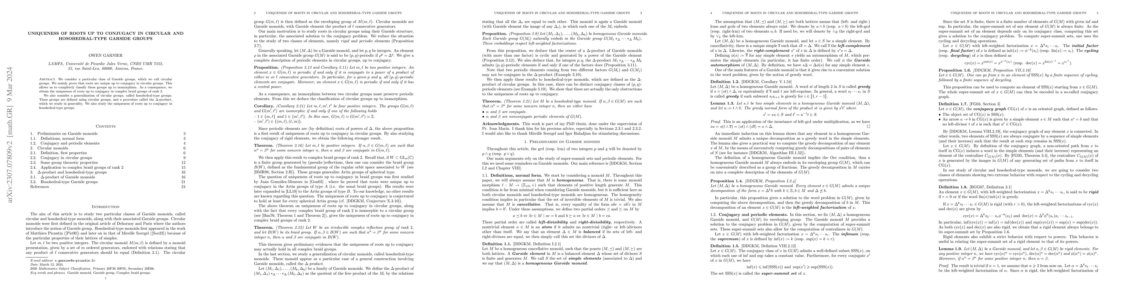 This paper proves the uniqueness of roots up to conjugacy in circular and hosohedral-type Garside groups, allowing for complete classification of these groups. As a result, it also establishes the uniqueness of roots in complex braid groups of rank 2.