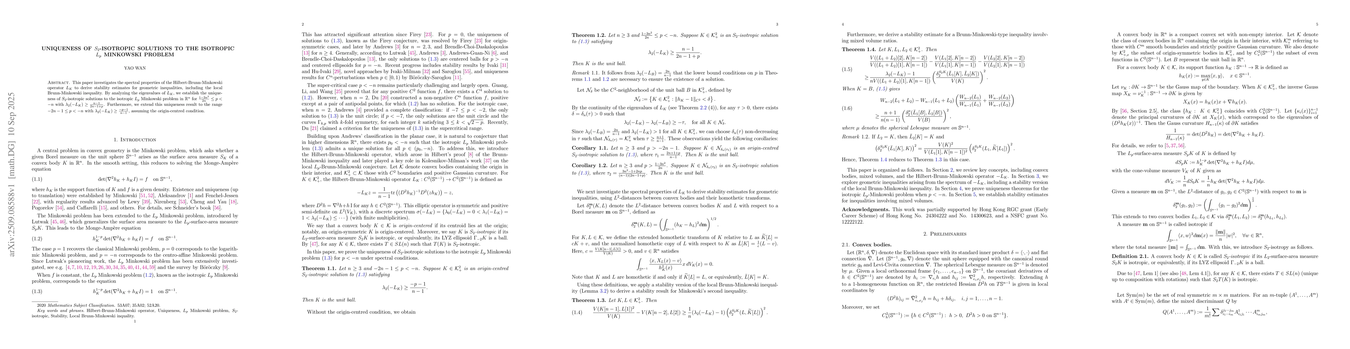 This paper investigates the spectral properties of the Hilbert-Brunn-Minkowski operator $L_K$ to derive stability estimates for geometric inequalities, including the local Brunn-Minkowski inequality. By analyzing the eigenvalues of $L_K$, we establish the uniqueness of $S_2$-isotropic solutions to the isotropic $L_p$ Minkowski problem in $\mathbb{R}^{n}$ for $\frac{1-3n^2}{2n}\leq p<-n$ with $\lambda_2(-L_K)\geq \frac{n-1}{2n-1+p}$. Furthermore, we extend this uniqueness result to the range $-2n-1 \leq p<-n$ with $\lambda_2(-L_K)\geq \frac{-p-1}{n-1}$, assuming the origin-centred condition.