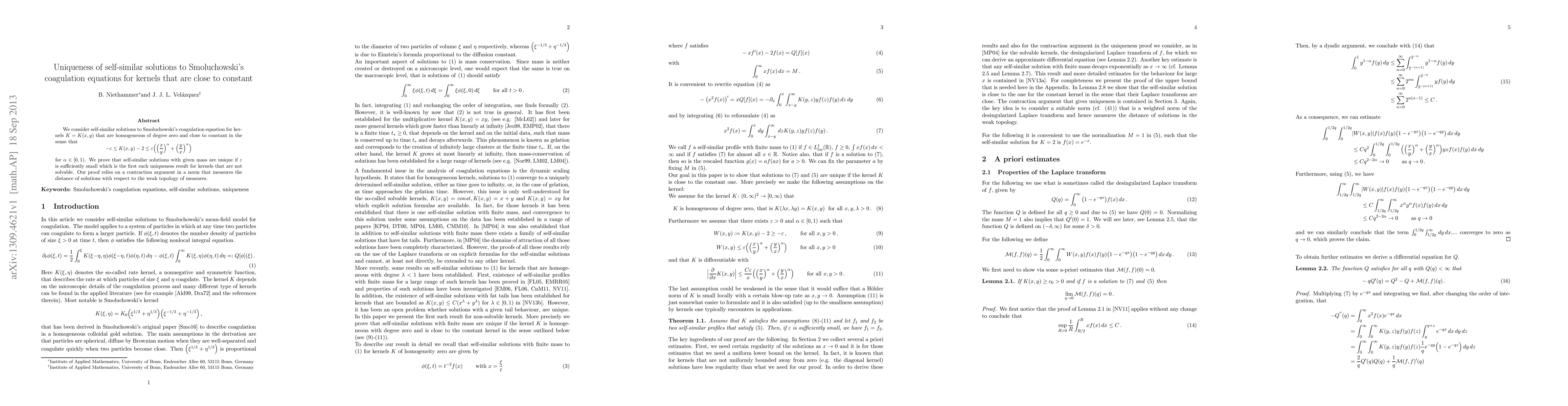 This paper proves the uniqueness of self-similar solutions to Smoluchowski's coagulation equation for kernels that are close to constant, using a contraction argument in a norm based on weak topology. The result is the first for kernels that are not solvable, provided the kernel's deviation from constant is sufficiently small.