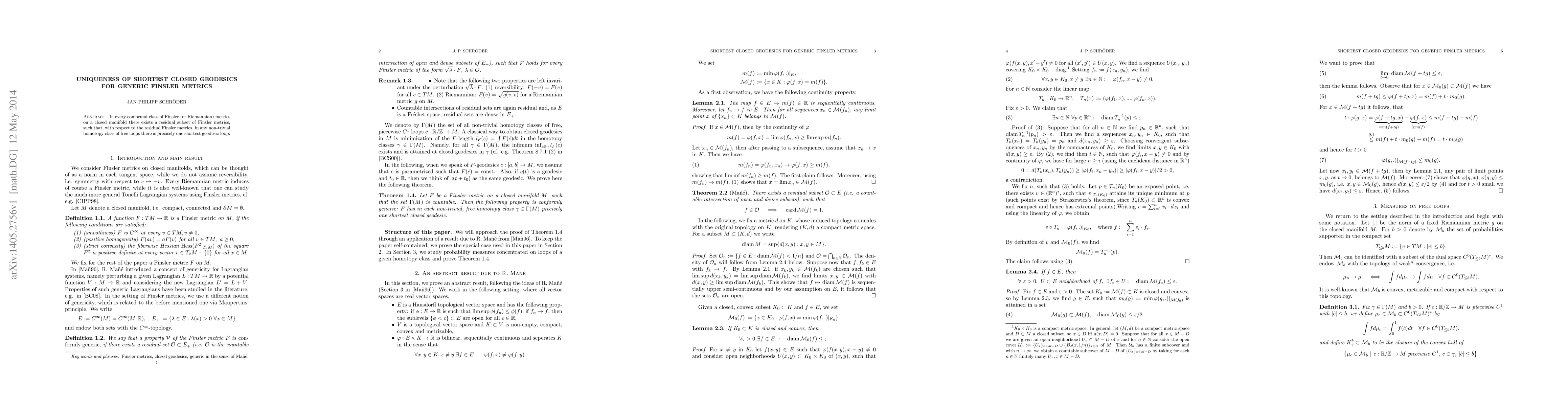 In every conformal class of Finsler (or Riemannian) metrics on a closed manifold there exists a residual subset of Finsler metrics, such that, with respect to the residual Finsler metrics, in any non-trivial homotopy class of free loops there is precisely one shortest geodesic loop.