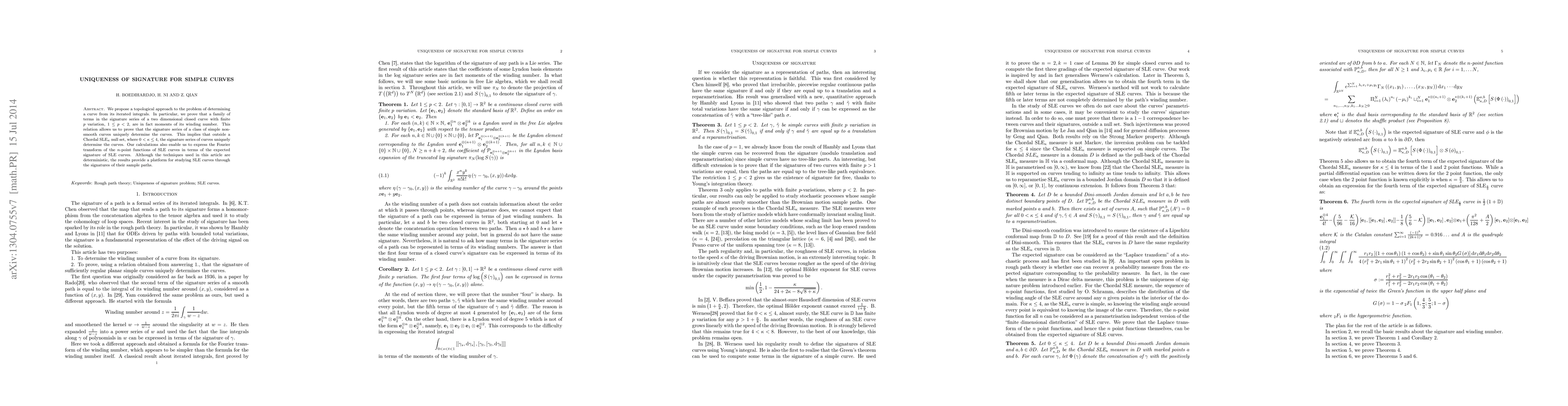 We propose a topological approach to the problem of determining a curve from its iterated integrals. In particular, we prove that a family of terms in the signature series of a two dimensional closed curve with finite p variation, 1\leq p<2, are in fact moments of its winding number. This relation allows us to prove that the signature series of a class of simple non-smooth curves uniquely determine the curves. This implies that outside a Chordal SLE_{\kappa} null set, where 0<\kappa\leq 4, the signature series of curves uniquely determine the curves. Our calculations also enable us to express the Fourier transform of the n-point functions of SLE curves in terms of the expected signature of SLE curves. Although the techniques used in this article are deterministic, the results provide a platform for studying SLE curves through the signatures of their sample paths.