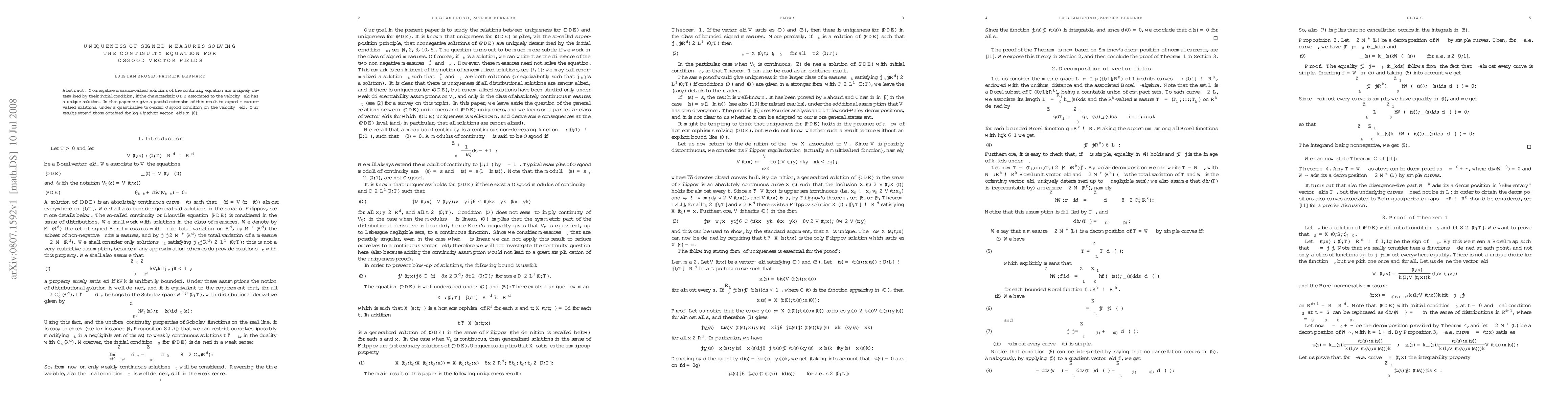 Nonnegative measure-valued solutions of the continuity equation are uniquely determined by their initial condition, if the characteristic ODE associated to the velocity field has a unique solution. In this paper we give a partial extension of this result to signed measure-valued solutions, under a quantitative two-sided Osgood condition on the velocity field. Our results extend those obtained for log-Lipschitz vector fields by Bahouri and Chemin.