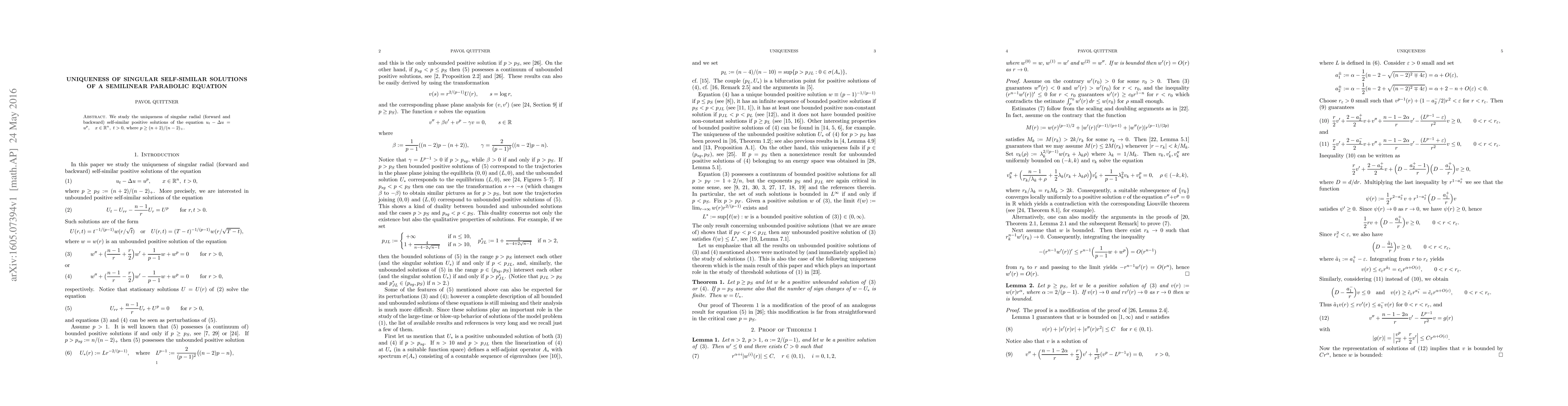We study the uniqueness of singular radial (forward and backward) self-similar positive solutions of the equation $u_t-\Delta u = u^p, \quad x\in{\mathbb R}^n,\ t>0,$ where $p\geq(n+2)/(n-2)_+$.