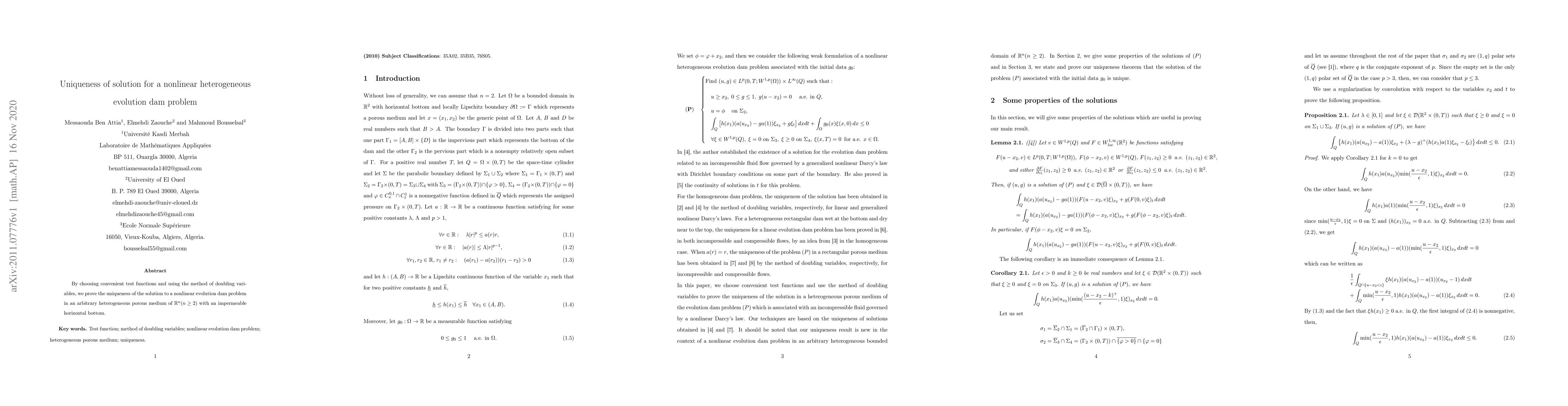 By choosing convenient test functions and using the method of doubling variables, we prove the uniqueness of the solution to a nonlinear evolution dam problem in an arbitrary heterogeneous porous medium of IR^n with an impermeable horizontal bottom.