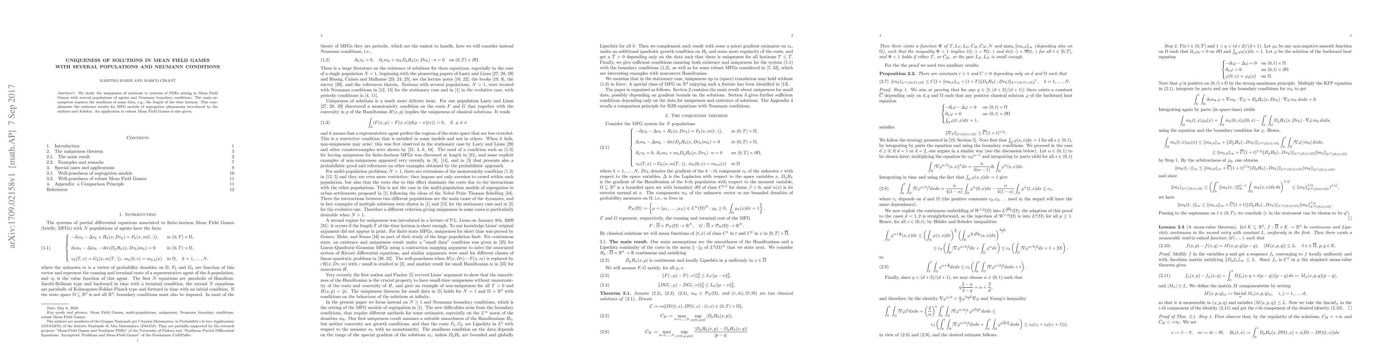 This paper investigates the uniqueness of solutions to PDE systems in Mean Field Games involving multiple populations and Neumann boundary conditions, assuming small data conditions. It complements previous existence results and extends the analysis to robust Mean Field Games.