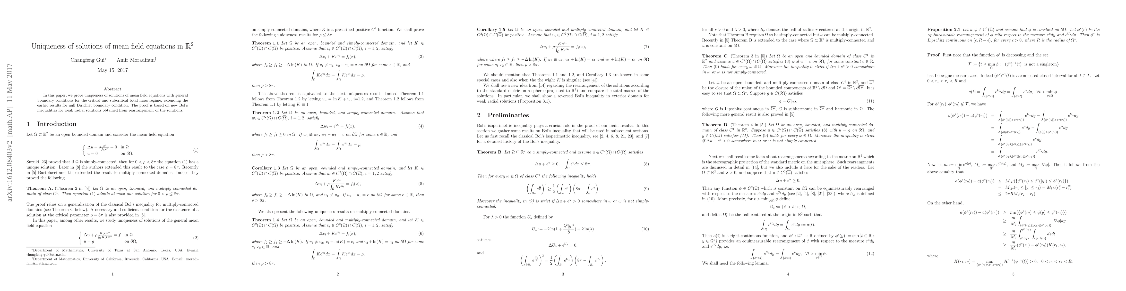 This paper proves the uniqueness of solutions for mean field equations in $\R^2$ under general boundary conditions, extending previous results for null Dirichlet conditions. The proof leverages new Bol's inequalities derived from the rearrangement of weak radial solutions.