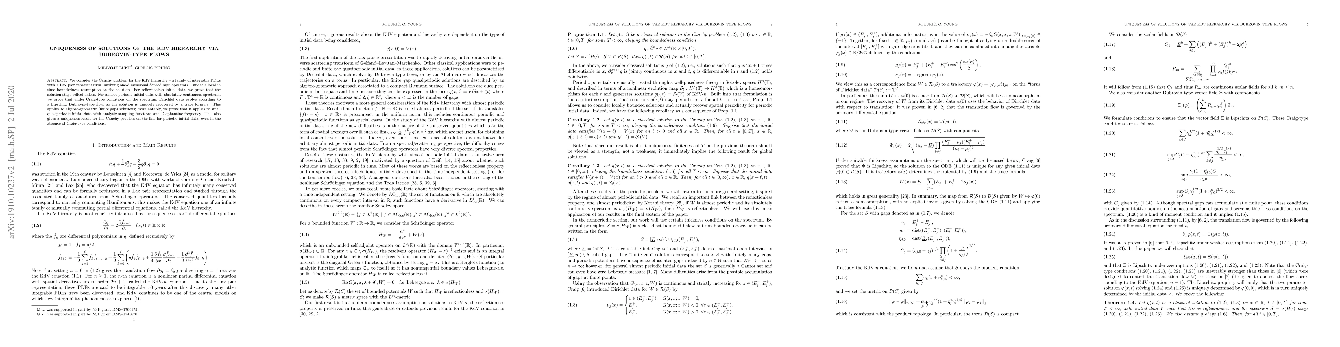 We consider the Cauchy problem for the KdV hierarchy -- a family of integrable PDEs with a Lax pair representation involving one-dimensional Schr\"odinger operators -- under a local in time boundedness assumption on the solution. For reflectionless initial data, we prove that the solution stays reflectionless. For almost periodic initial data with absolutely continuous spectrum, we prove that under Craig-type conditions on the spectrum, Dirichlet data evolve according to a Lipschitz Dubrovin-type flow, so the solution is uniquely recovered by a trace formula. This applies to algebro-geometric (finite gap) solutions; more notably, we prove that it applies to small quasiperiodic initial data with analytic sampling functions and Diophantine frequency. This also gives a uniqueness result for the Cauchy problem on the line for periodic initial data, even in the absence of Craig-type conditions.