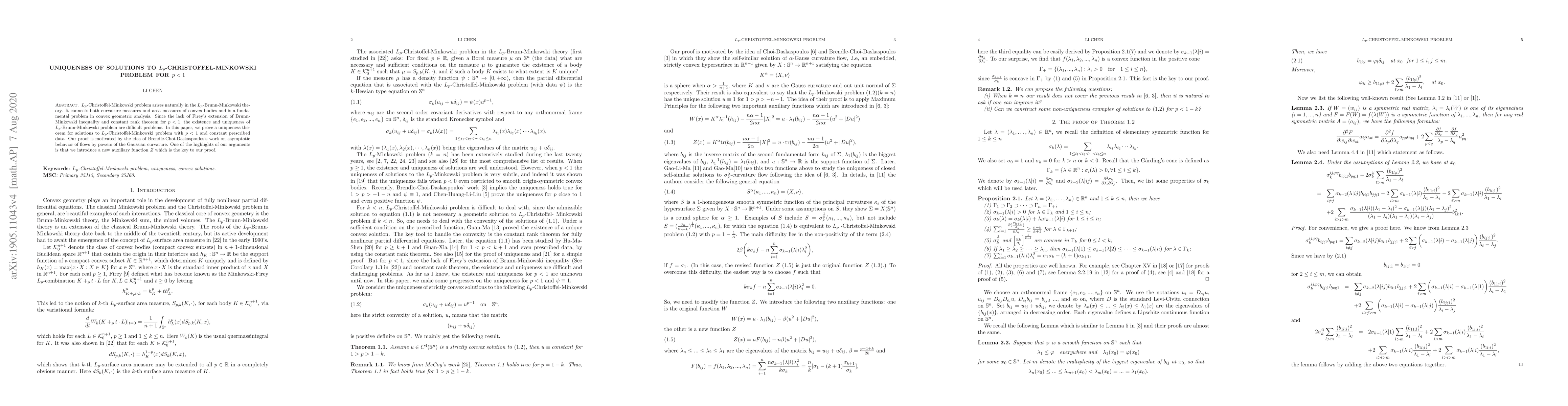 Researchers prove uniqueness of solutions to Lp-Christoffel-Minkowski problem for p<1, a fundamental issue in convex geometric analysis, with implications for curvature measures and area measures of convex bodies.