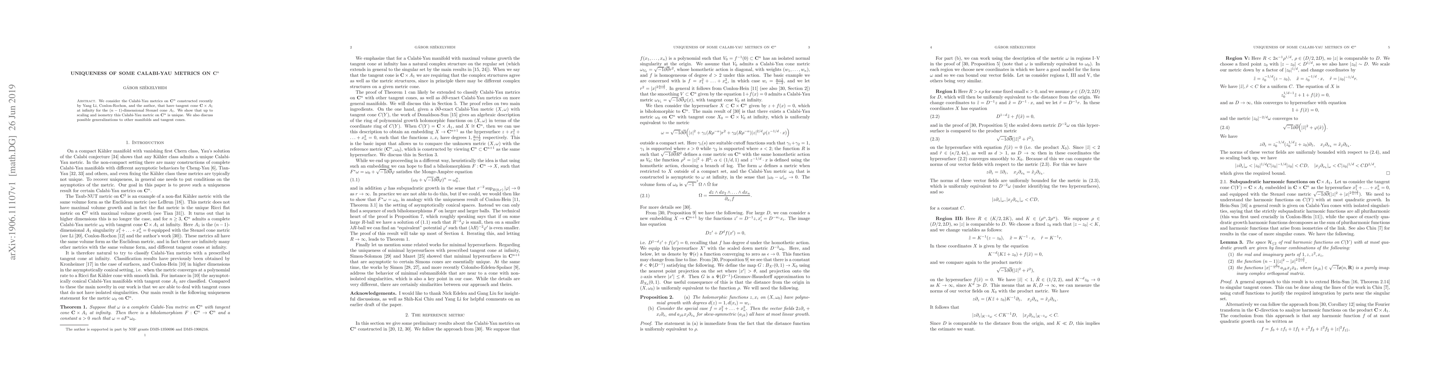 This paper demonstrates the uniqueness of a specific Calabi-Yau metric on $\mathbf{C}^n$ with a tangent cone $\mathbf{C}\times A_1$ at infinity, up to scaling and isometry. It also explores potential extensions to other manifolds and different tangent cones.