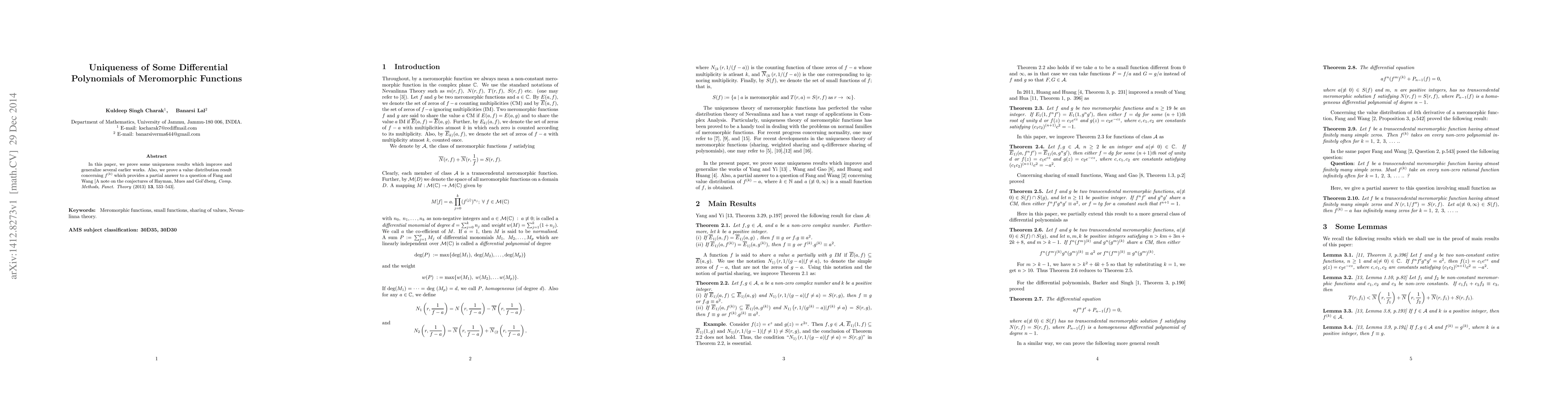 In this paper, we prove some uniqueness results which improve and generalize several earlier works. Also, we prove a value distribution result concerning $f^{(k)}$ which provides a partial answer to a question of Fang and Wang [A note on the conjectures of Hayman, Mues and Gol'dberg, Comp. Methods, Funct. Theory (2013)13, 533-543].