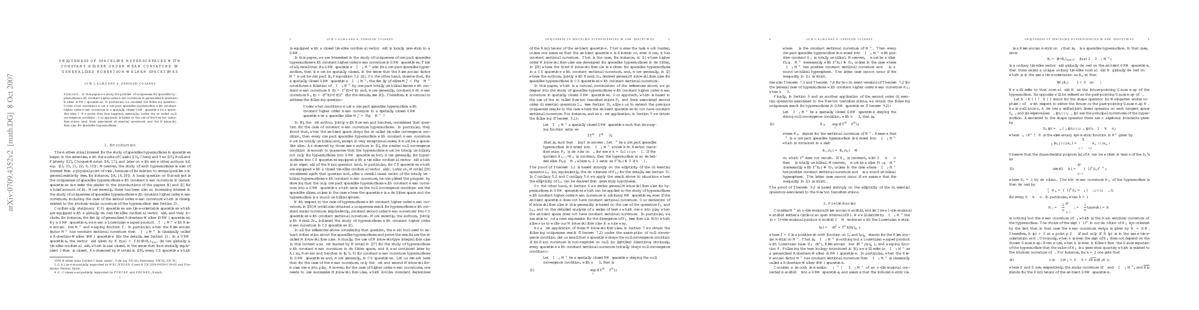 In this paper we study the problem of uniqueness for spacelike hypersurfaces with constant higher order mean curvature in generalized Robertson-Walker (GRW) spacetimes. In particular, we consider the following question: Under what conditions must a compact spacelike hypersurface with constant higher order mean curvature in a spatially closed GRW spacetime be a spacelike slice? We prove that this happens, esentially, under the so called convergence condition. Our approach is based on the use of the Newton transformations (and their associated differential operators) and the Minkowski formulae for spacelike hypersurfaces.