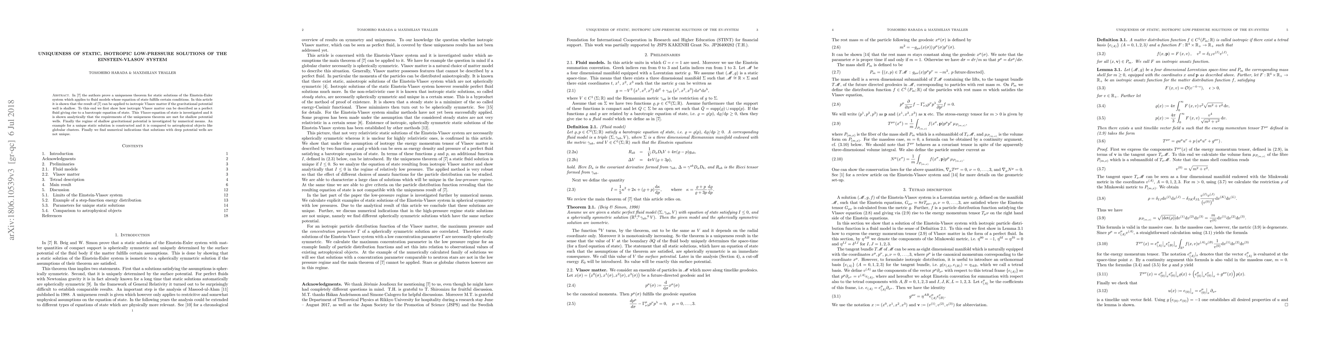 Due to R. Beig and W. Simon (1990) there is a uniqueness theorem for static solutions of the Einstein-Euler system which applies to fluid models whose equation of state fulfills certain conditions. In this article it is shown that this uniqueness theorem can be applied to isotropic Vlasov matter, if the gravitational potential well is shallow. To this end we first show how isotropic Vlasov matter can be described as a perfect fluid giving rise to a barotropic equation of state. This 'Vlasov' equation of state is investigated and it is shown analytically that the requirements of the uniqueness theorem are met for shallow potential wells. Finally the regime of shallow gravitational potential is investigated by numerical means. An example for a unique static solution is constructed and it is compared to astrophysical objects like globular clusters. Finally we find numerical indications that solutions with deep potential wells are not unique.