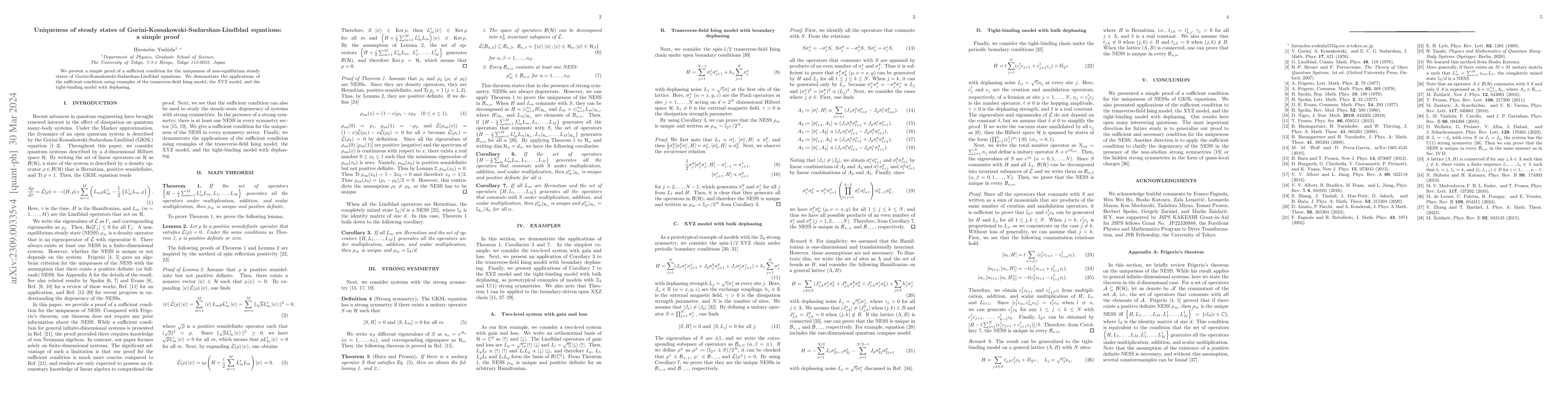 This paper provides a straightforward proof for a condition ensuring the uniqueness of non-equilibrium steady states in Gorini-Kossakowski-Sudarshan-Lindblad equations, with applications demonstrated through the transverse-field Ising model, XYZ model, and tight-binding model with dephasing.