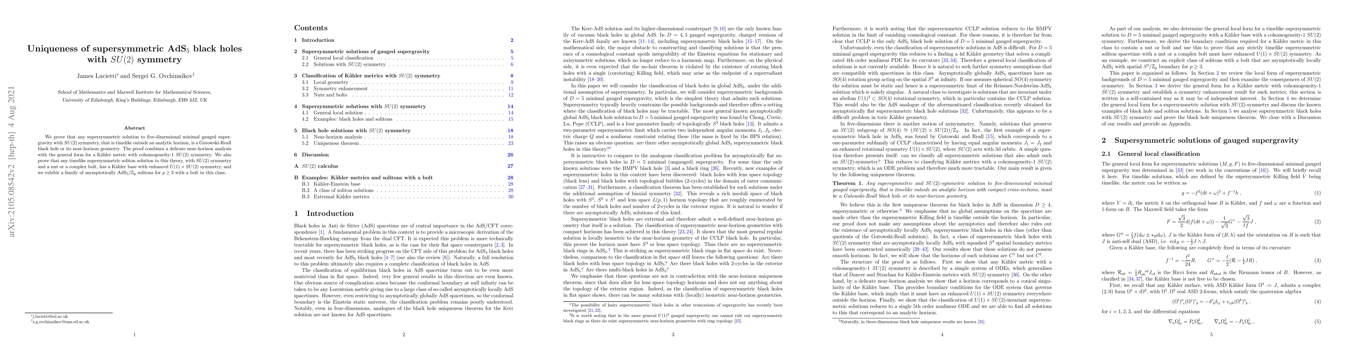 This paper proves that supersymmetric AdS$_5$ black holes with $SU(2)$ symmetry are unique, specifically identifying them as Gutowski-Reall black holes or their near-horizon geometries. It also demonstrates that timelike soliton solutions with $SU(2)$ symmetry exhibit enhanced $U(1)\times SU(2)$ symmetry and presents a family of asymptotically AdS$_5/\mathbb{Z}_p$ solitons with a bolt.